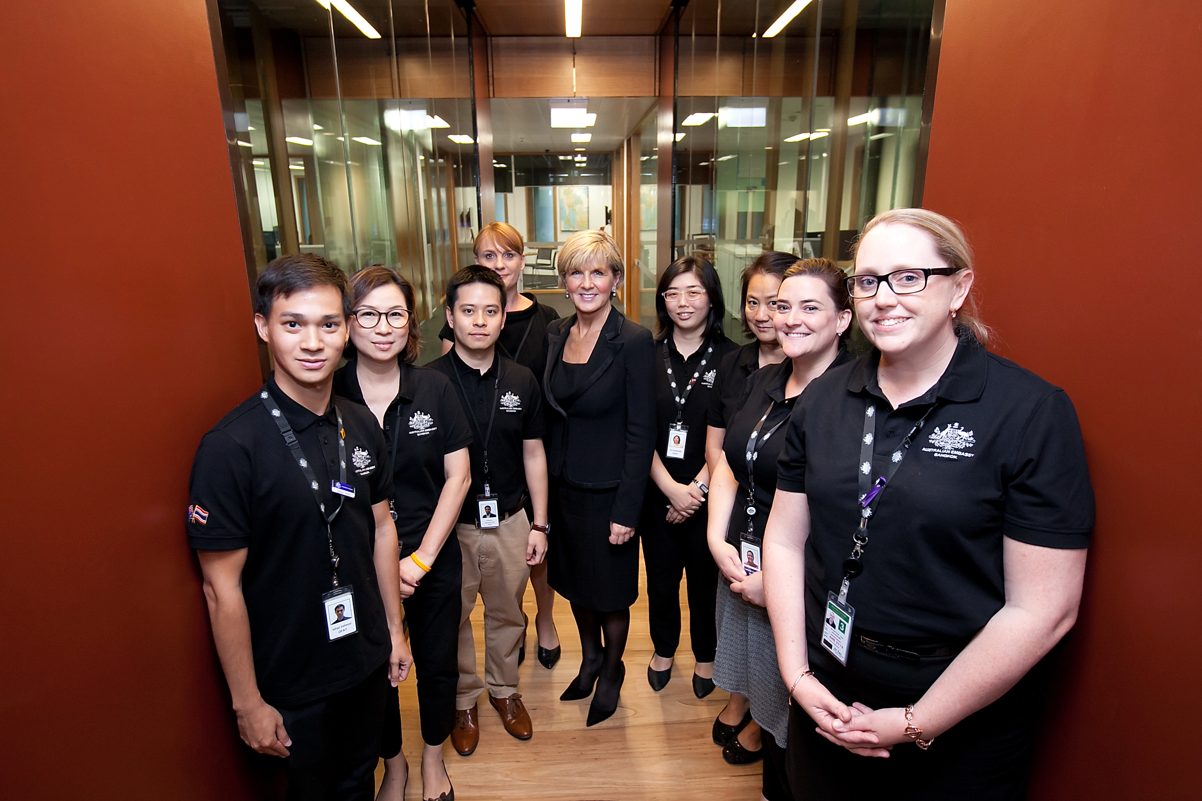 Foreign Minister Julie Bishop with consular staff at the new Australian Embassy in Bangkok. Thailand, Bangkok, 3 August 2017.