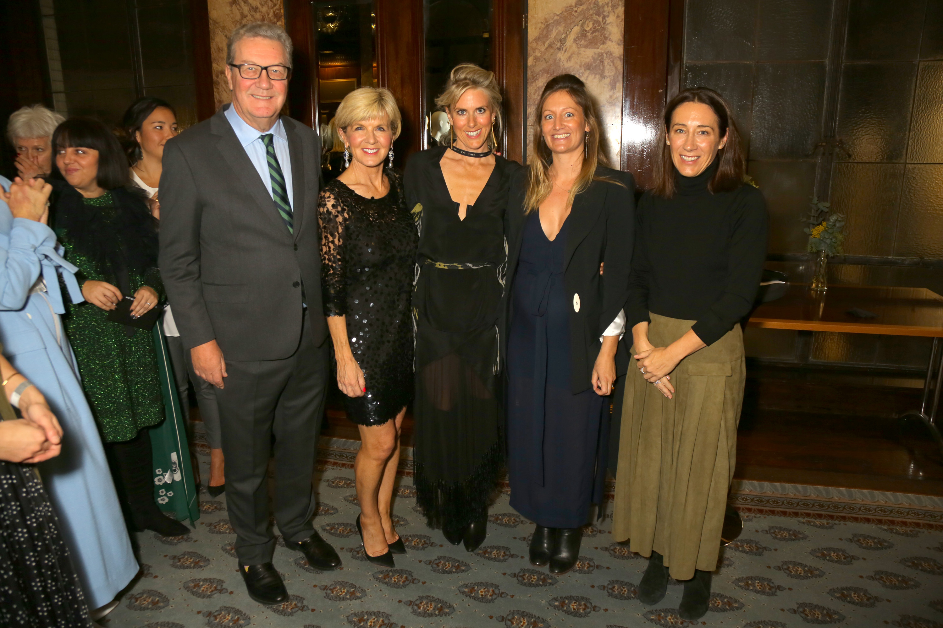 Minister for Foreign Affairs, the Hon Julie Bishop MP joins the organisers of an Australian Fashion Council event after speaking about sustainable fashion and how fashion benefits the Australian economy. Pictured left to right are: , Australian High Commissioner to the UK, Alexander Downer AC; Kit Willow, designer of Kit-X; Courtney Miller, Australian Fashion Council; and Edwina McCann, Editor-in-Chief Vogue Australia. Photo credit: Australian Fashion Council.