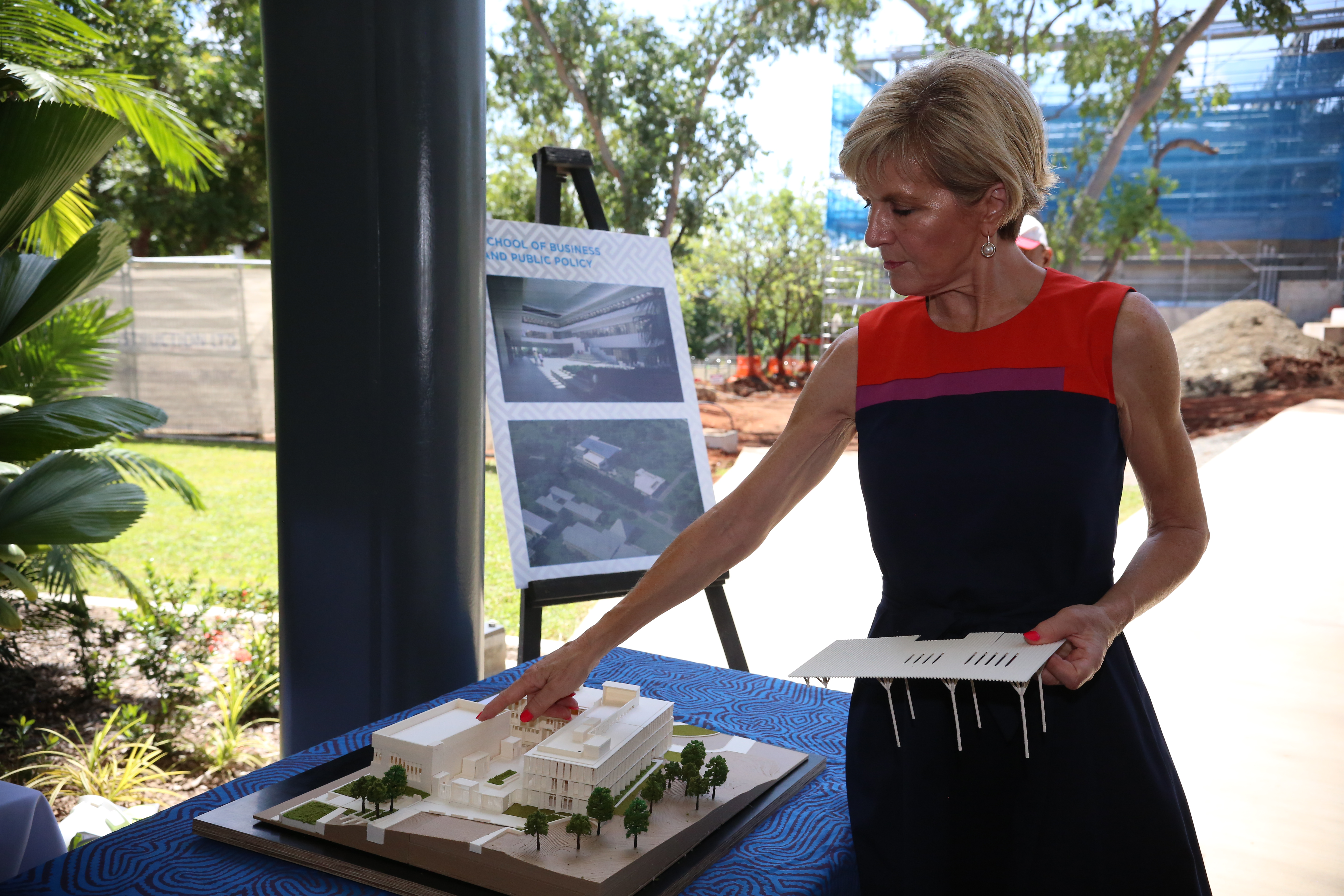 Foreign Minister Julie Bishop looking at the model of the new School of Business and Public Policy currently under construction.