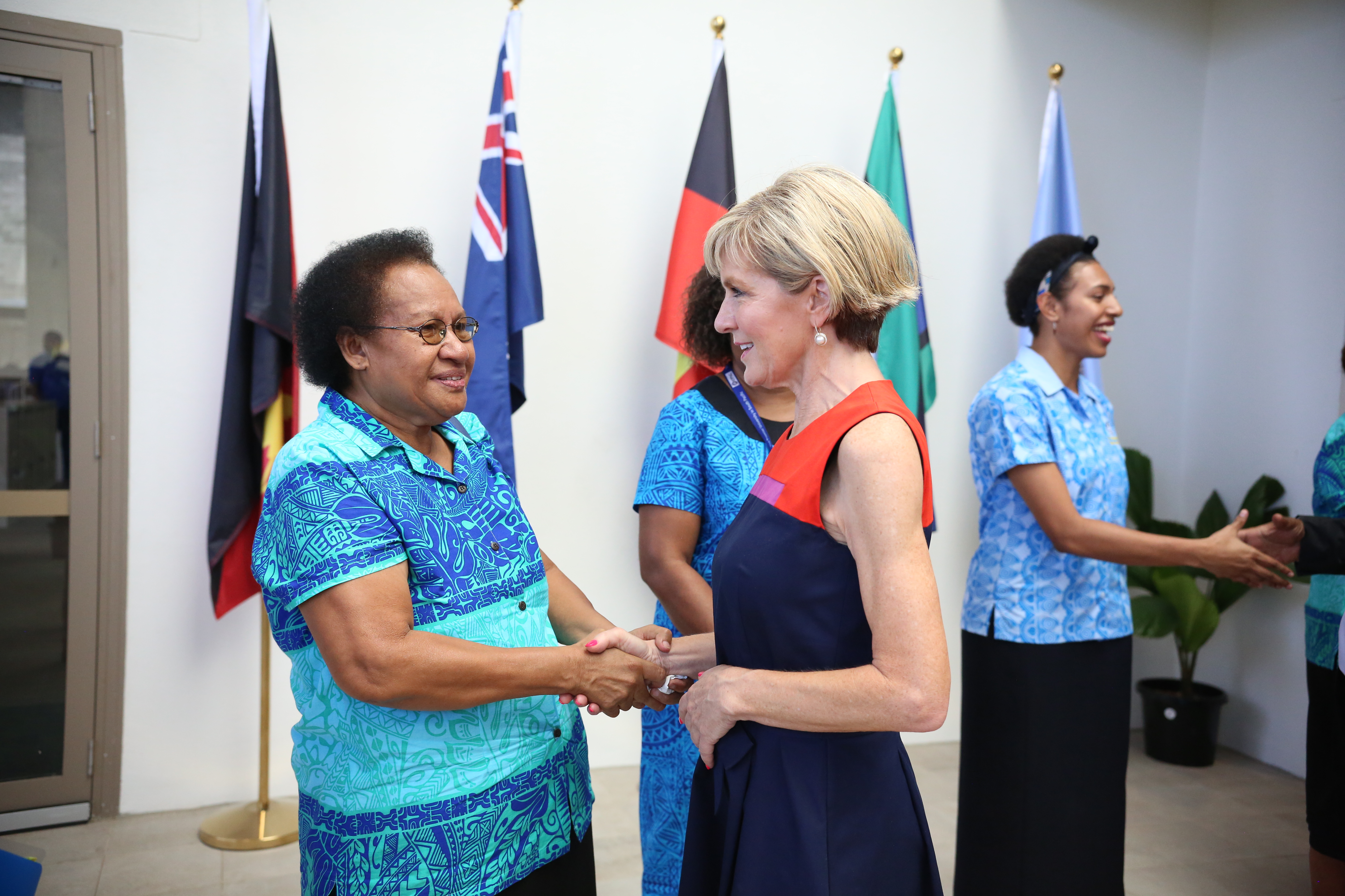 Foreign Minister Julie Bishop meets a staff member of UPNG during the tour of the new Students Services Building.