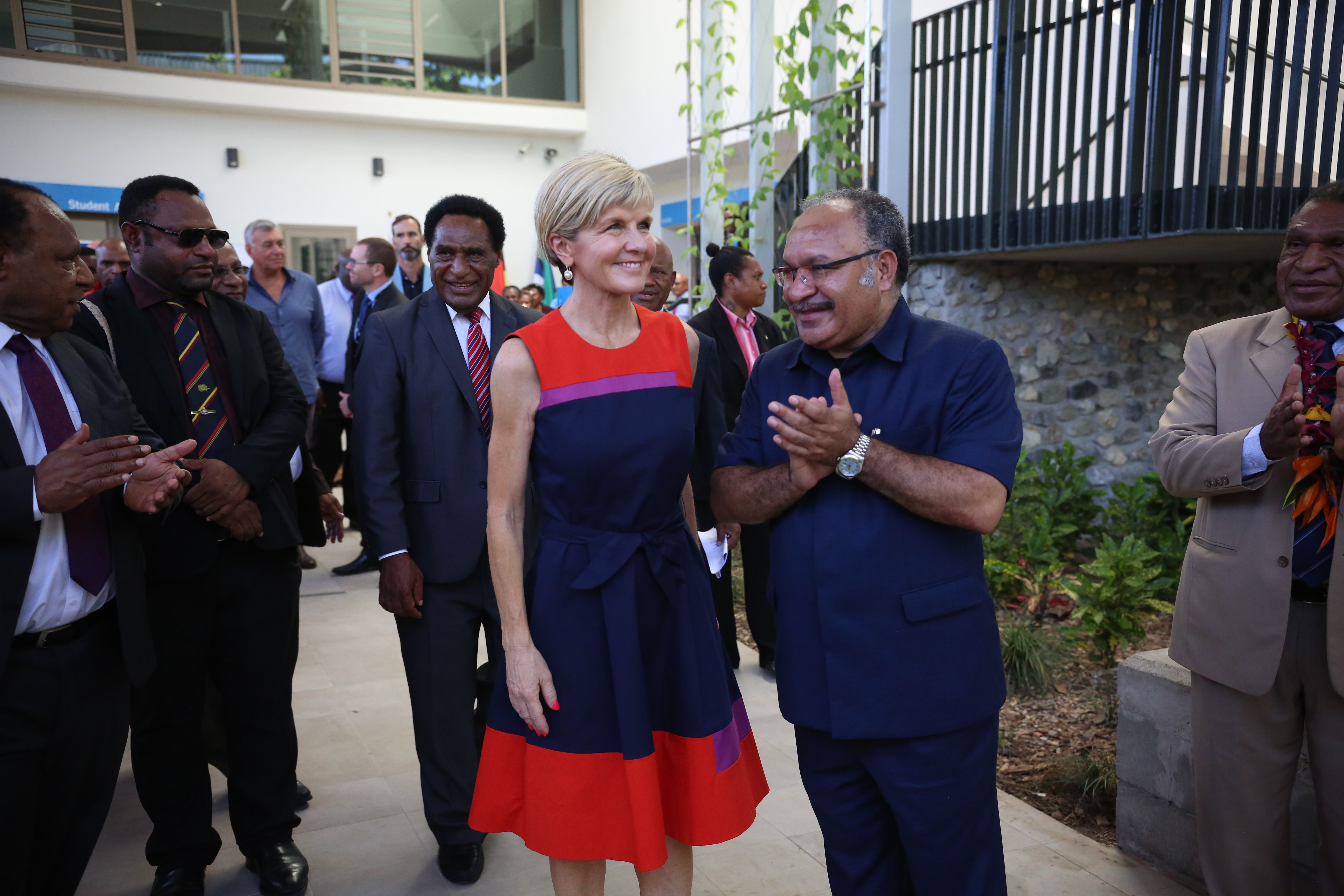 Foreign Minister Julie Bishop and PNG Prime Minister Peter O’Neill greet staff and students as they conclude the tour of the new Students Services Building.