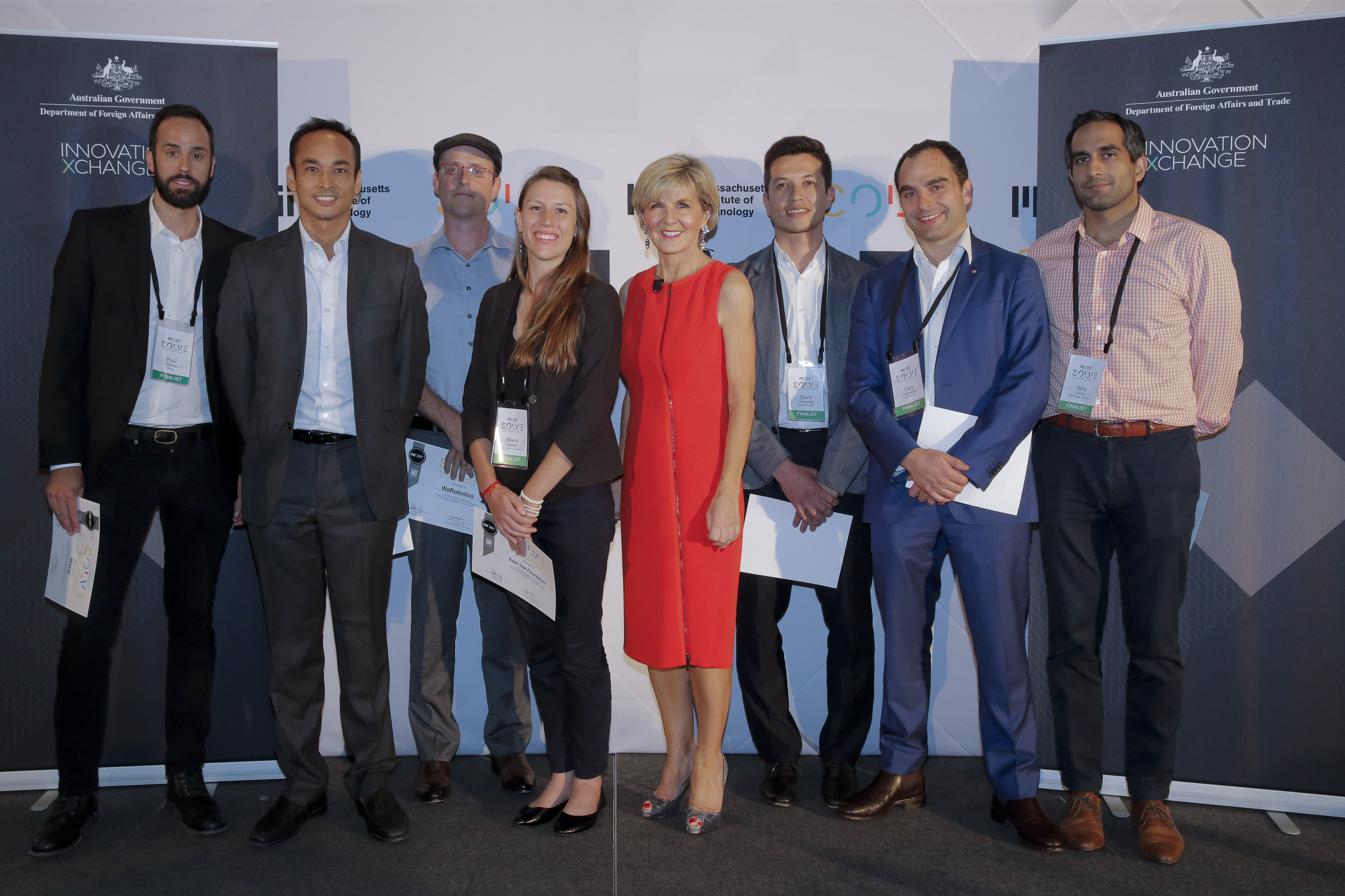 Foreign Minister Julie Bishop with successful participants at the MIT Solve, Atlassian and iXc live pitch event in New York on 17 September 2017.