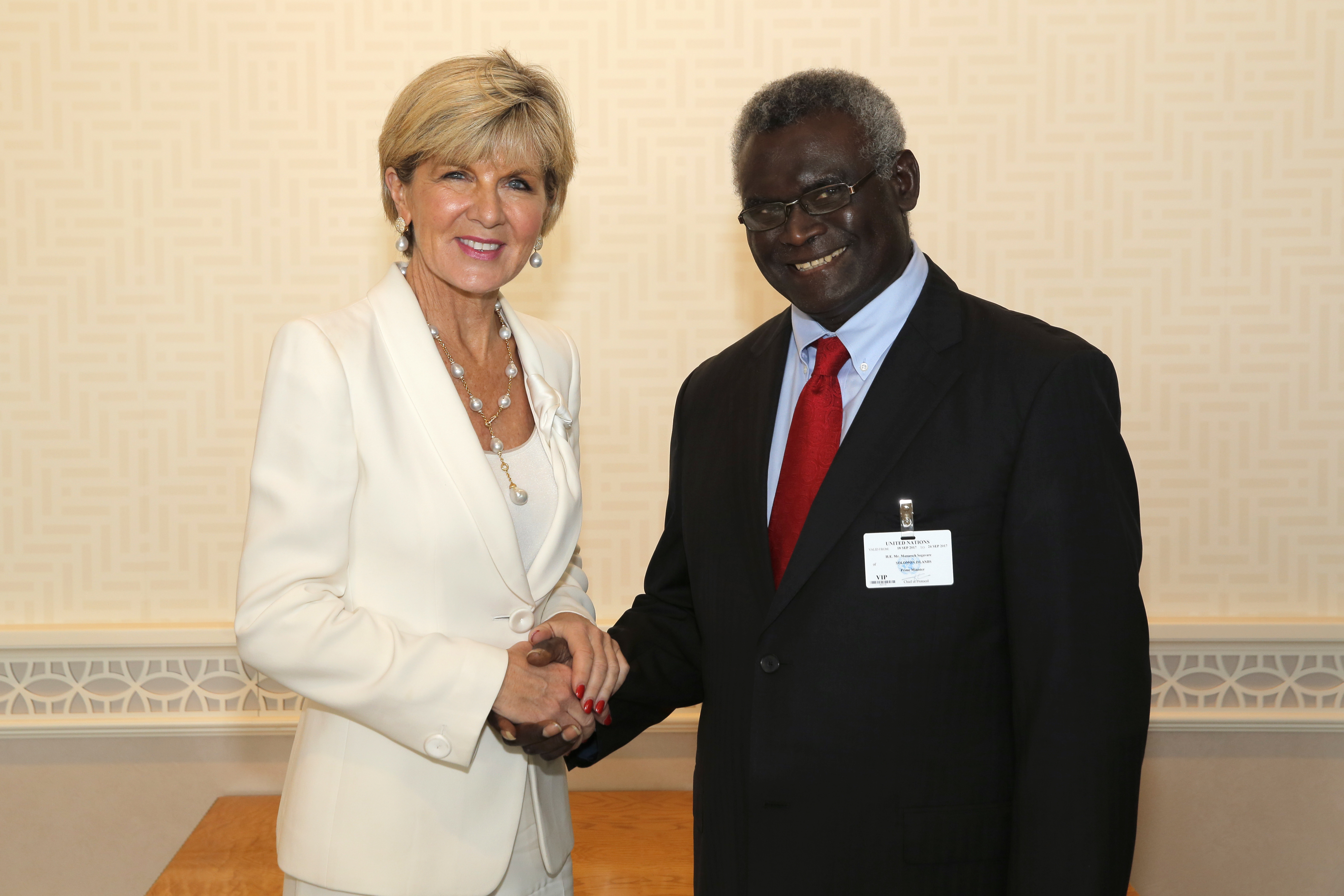 Foreign Minister Julie Bishop meets with the Prime Minister of Solomon Islands, the Hon Manasseh Sogavare MP, at the United Nations in New York on 19 September 2017.