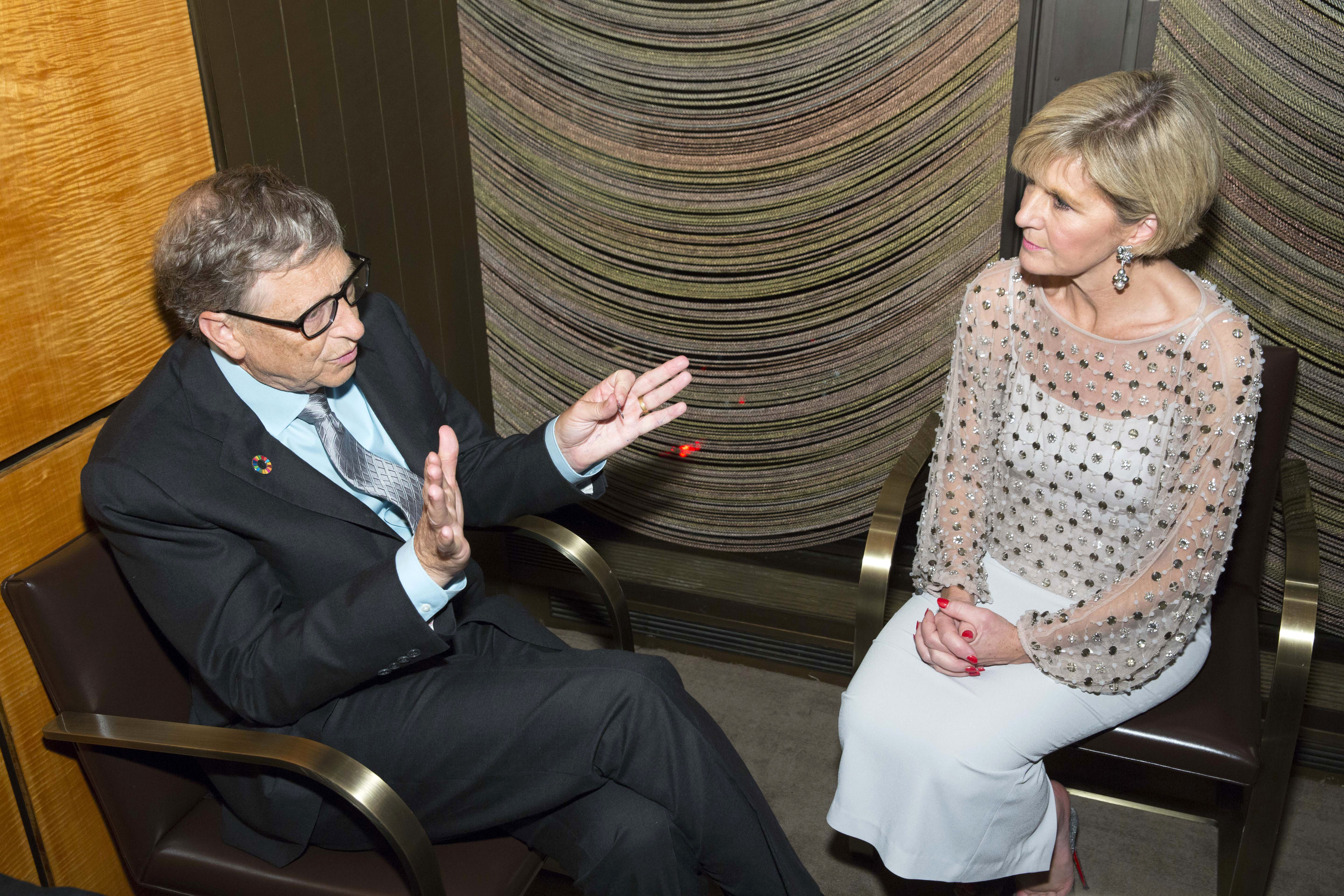 Foreign Minister Julie Bishop meets with philanthropist Bill Gates on the margins of the United Nations General Assembly in New York on 20 September 2017.