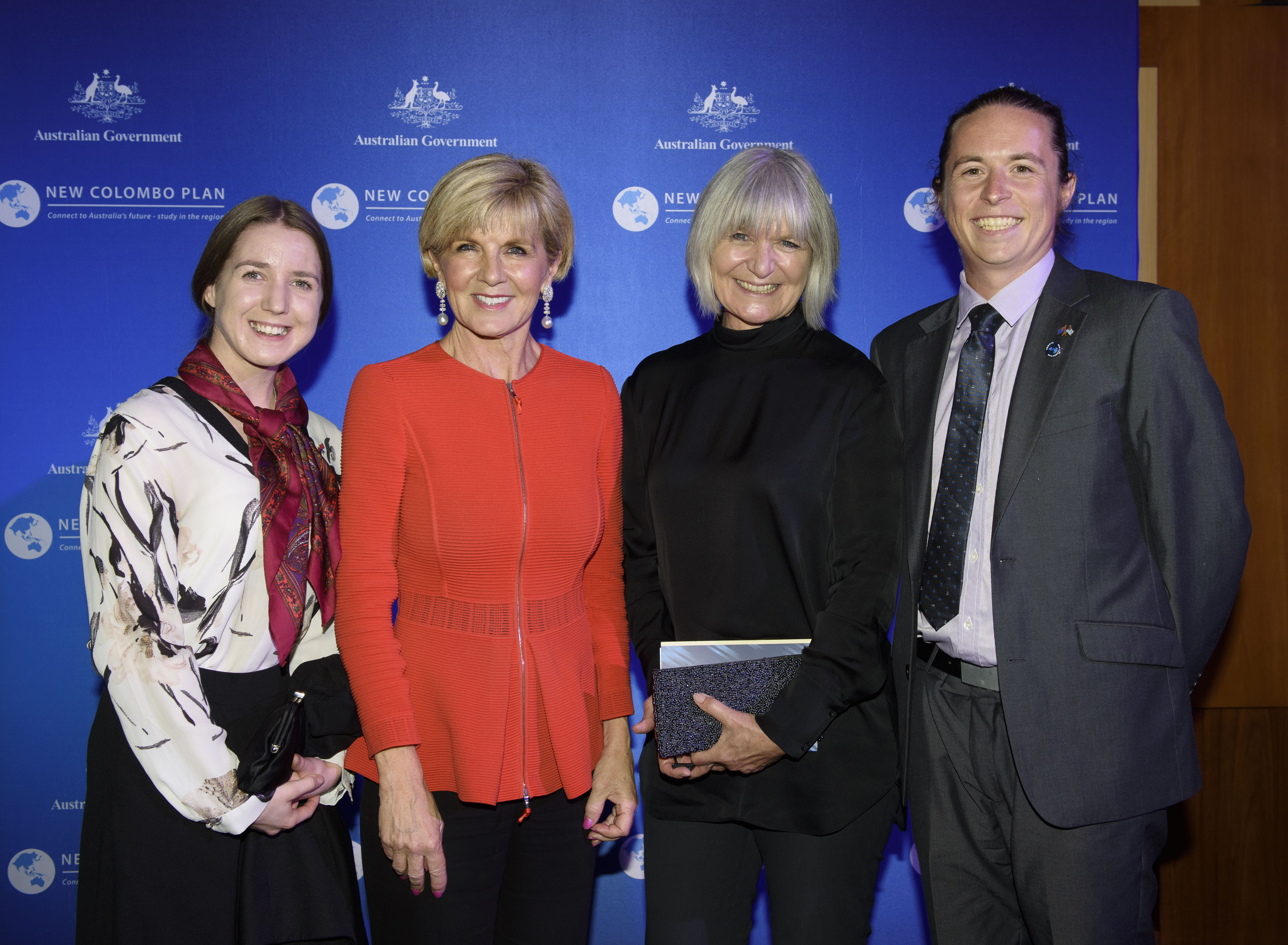 Foreign Minister Julie Bishop with (L-R) scholar Bianca Hoffrichter, Associate Professor Jane Lawrence, and NCP alumnus Michael Dyer from the University of South Australia.