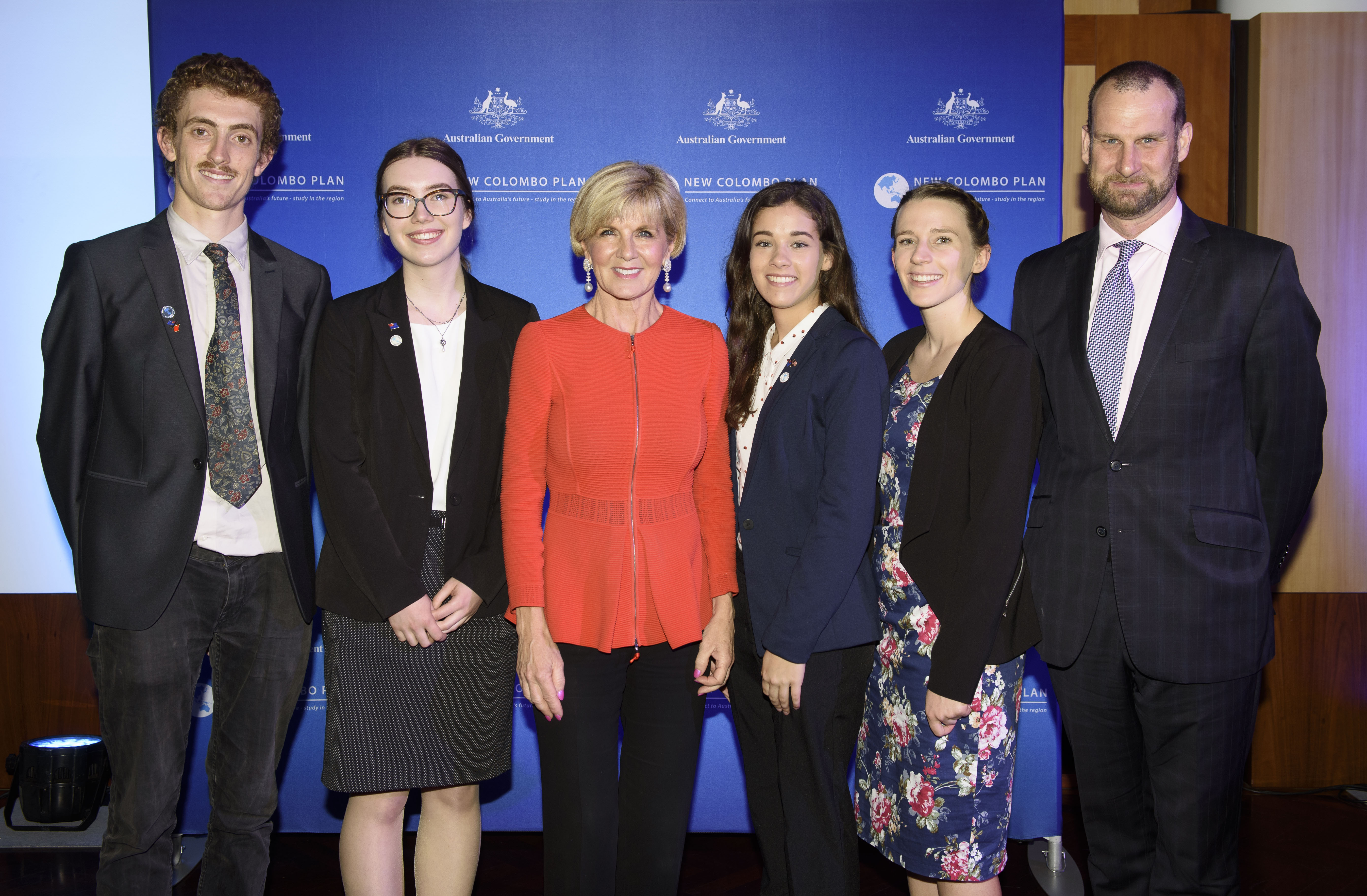 Foreign Minister Julie Bishop with (L-R) Theo Stapleton, NCP Alumnus, scholars Zoe Fitzgerald, Ameilia Catterick-Stoll and Hayley Winchcombe, Professor Kent Anderson, University of Western Australia.