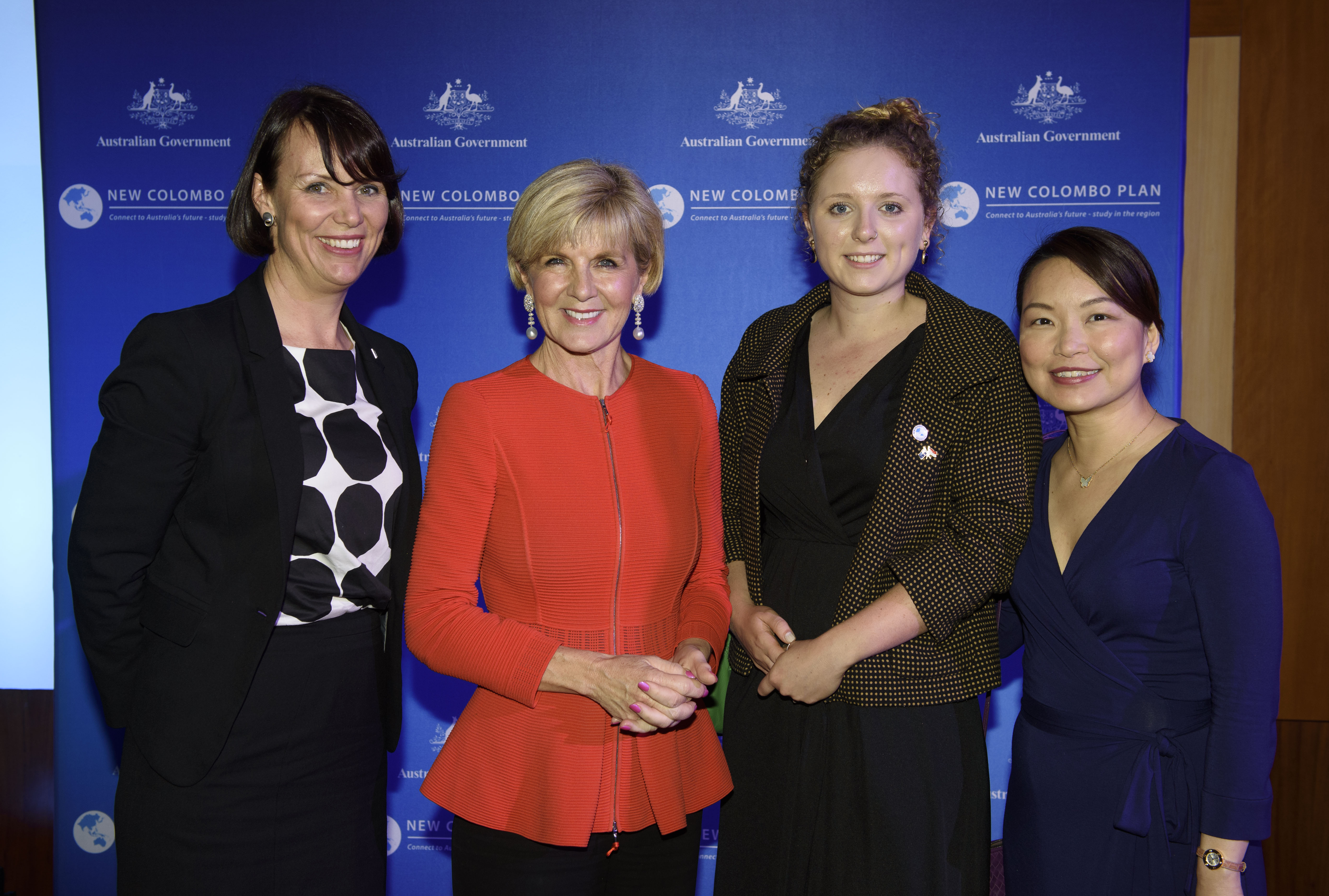 Foreign Minister Julie Bishop with (L-R) Ms Bronte Neyland, scholar Mia Dunphy, and Miss Christine Kan, Victoria University. Photo Credit: DFAT