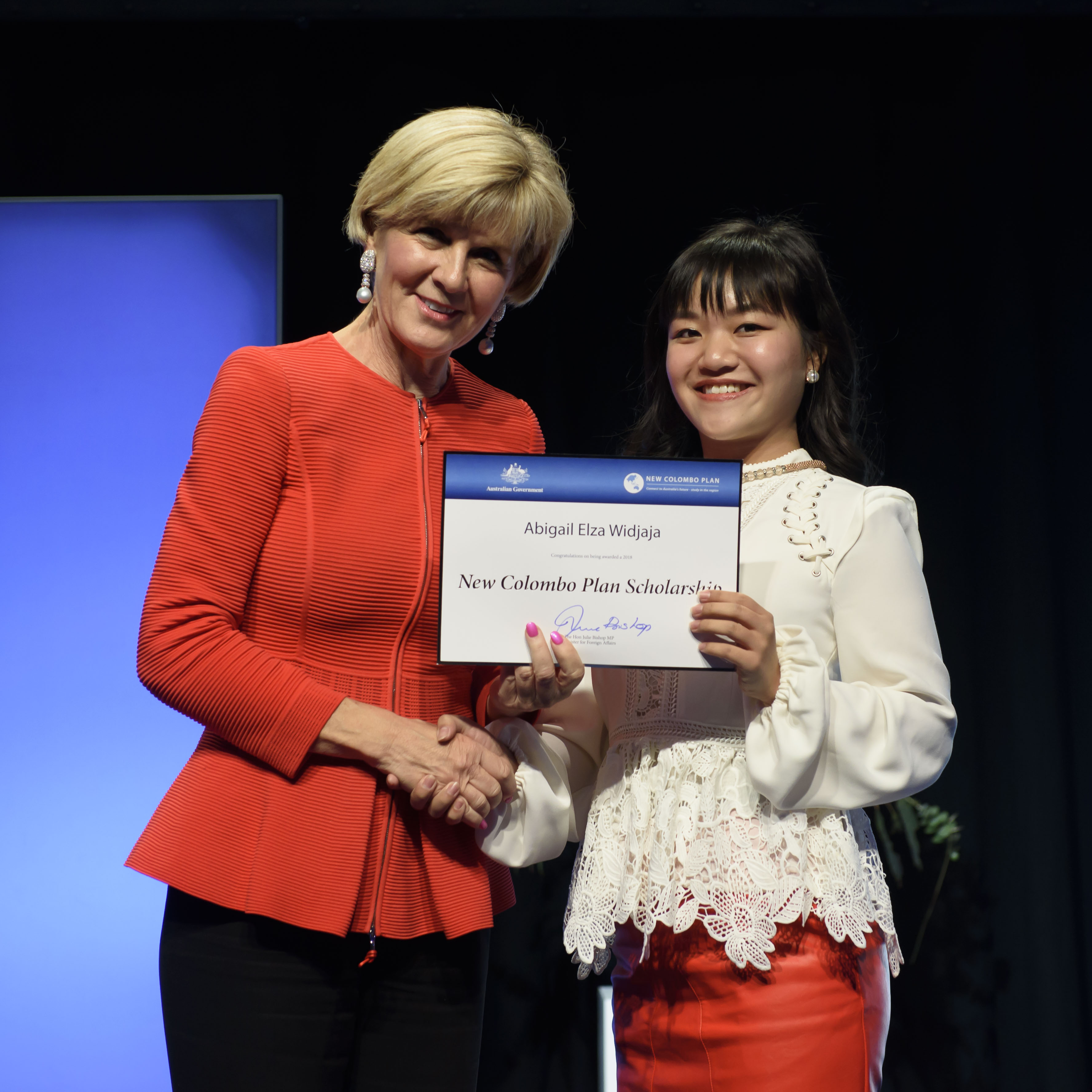 Foreign Minister Julie Bishop with Abigail Elza Widjaja, 2018 Republic of Korea Scholar, the University of Sydney