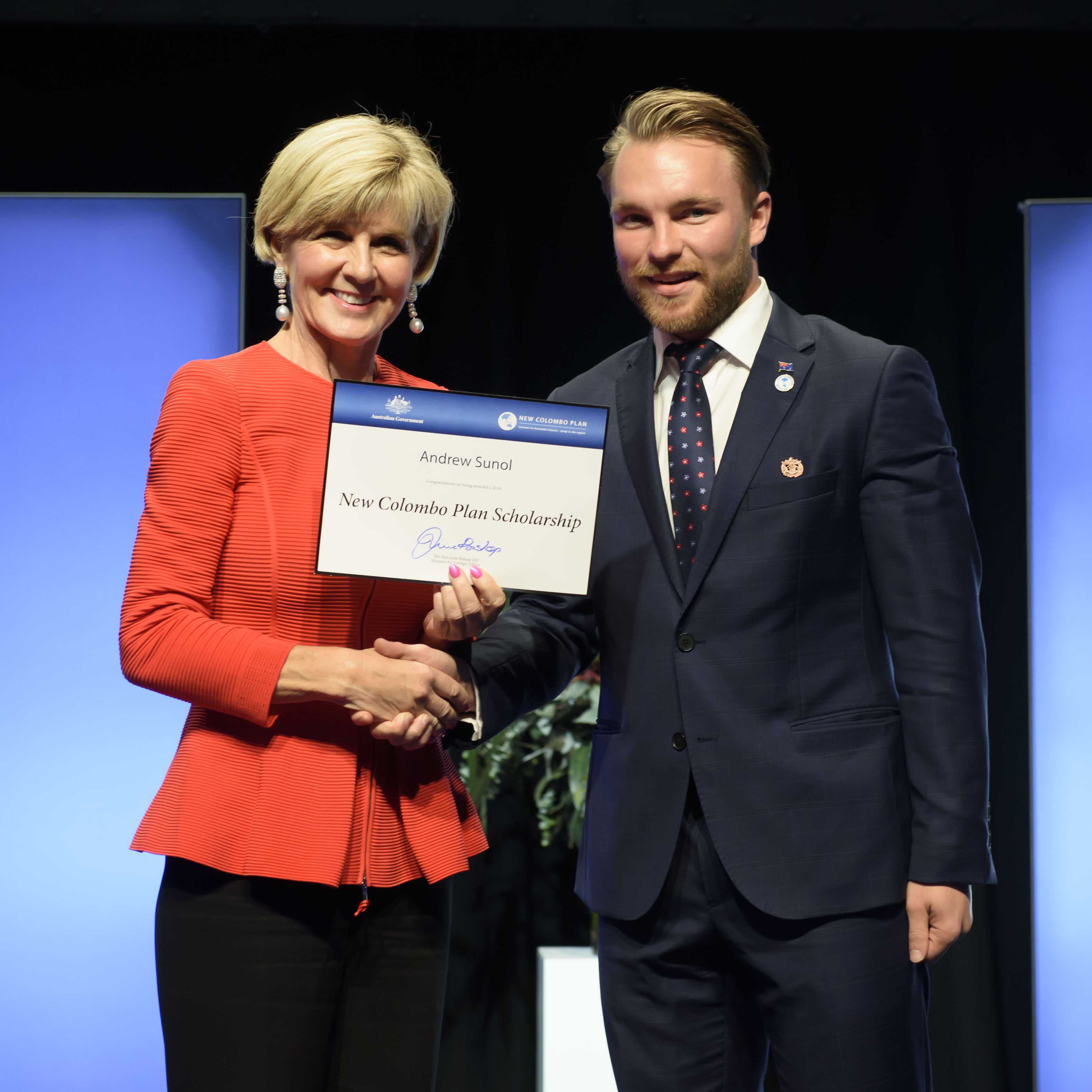 Foreign Minister Julie Bishop with Andrew Sunol, 2018 Hong Kong Scholar, the University of Newcastle