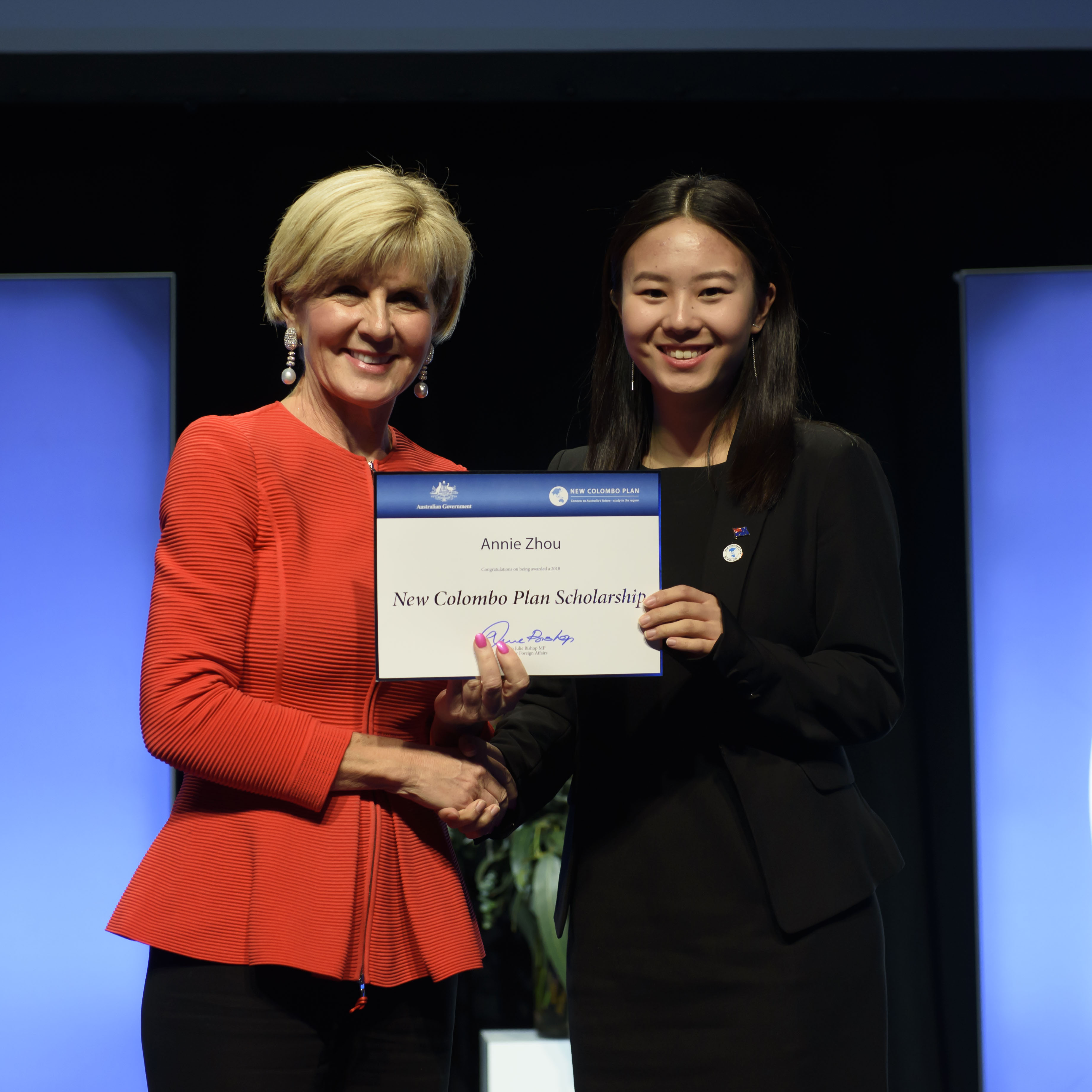 Foreign Minister Julie Bishop with Annie Zhou, 2018 Taiwan Scholar, Australian National University