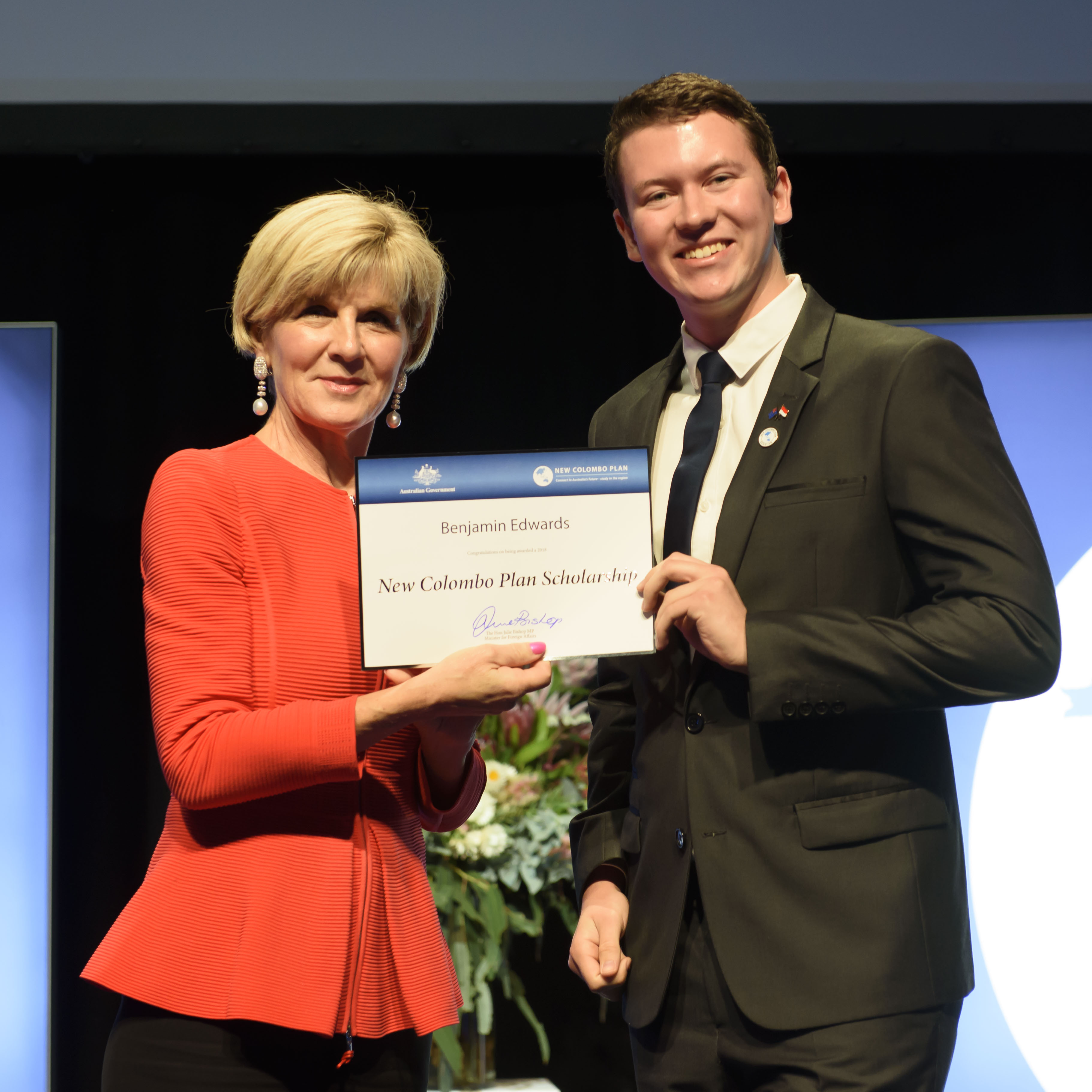 Foreign Minister Julie Bishop with Benjamin Edwards, 2018 Indonesia Scholar, Macquarie University
