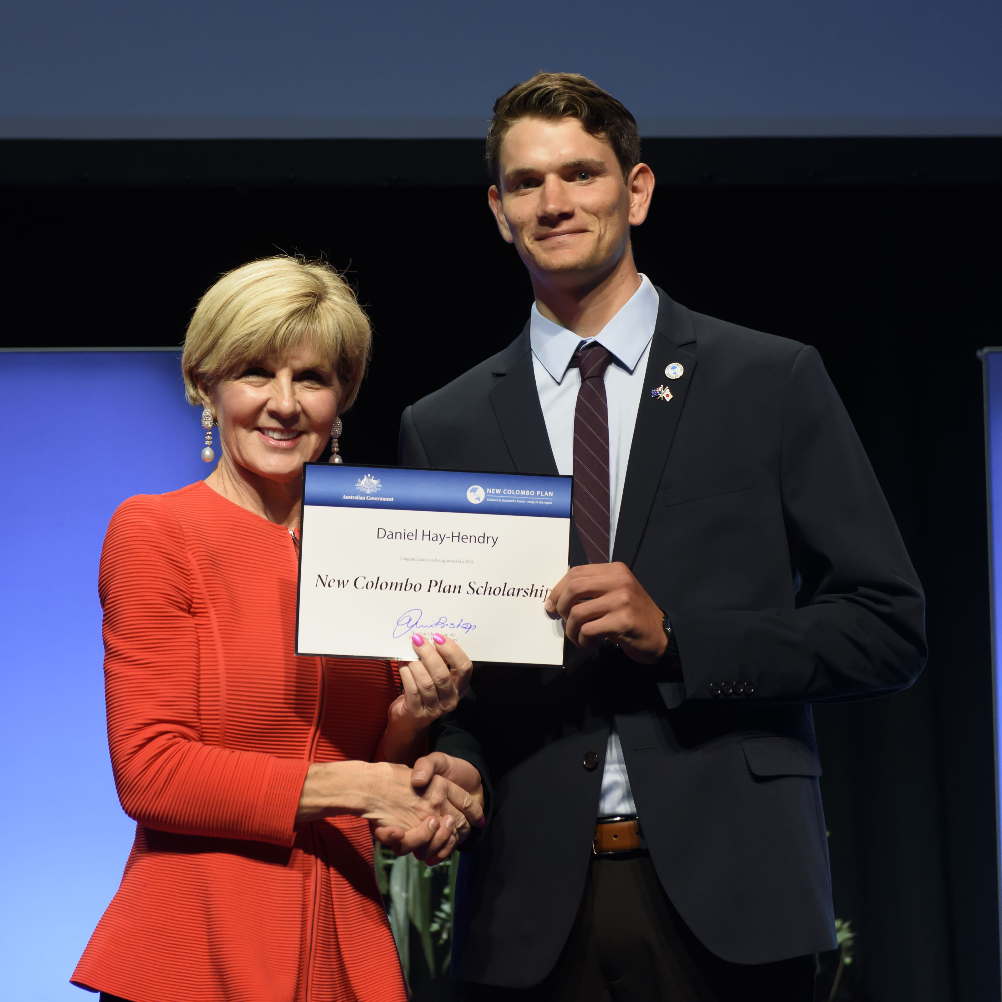 Foreign Minister Julie Bishop with Daniel Hay-Hendry, 2018 Japan Scholar, Murdoch University