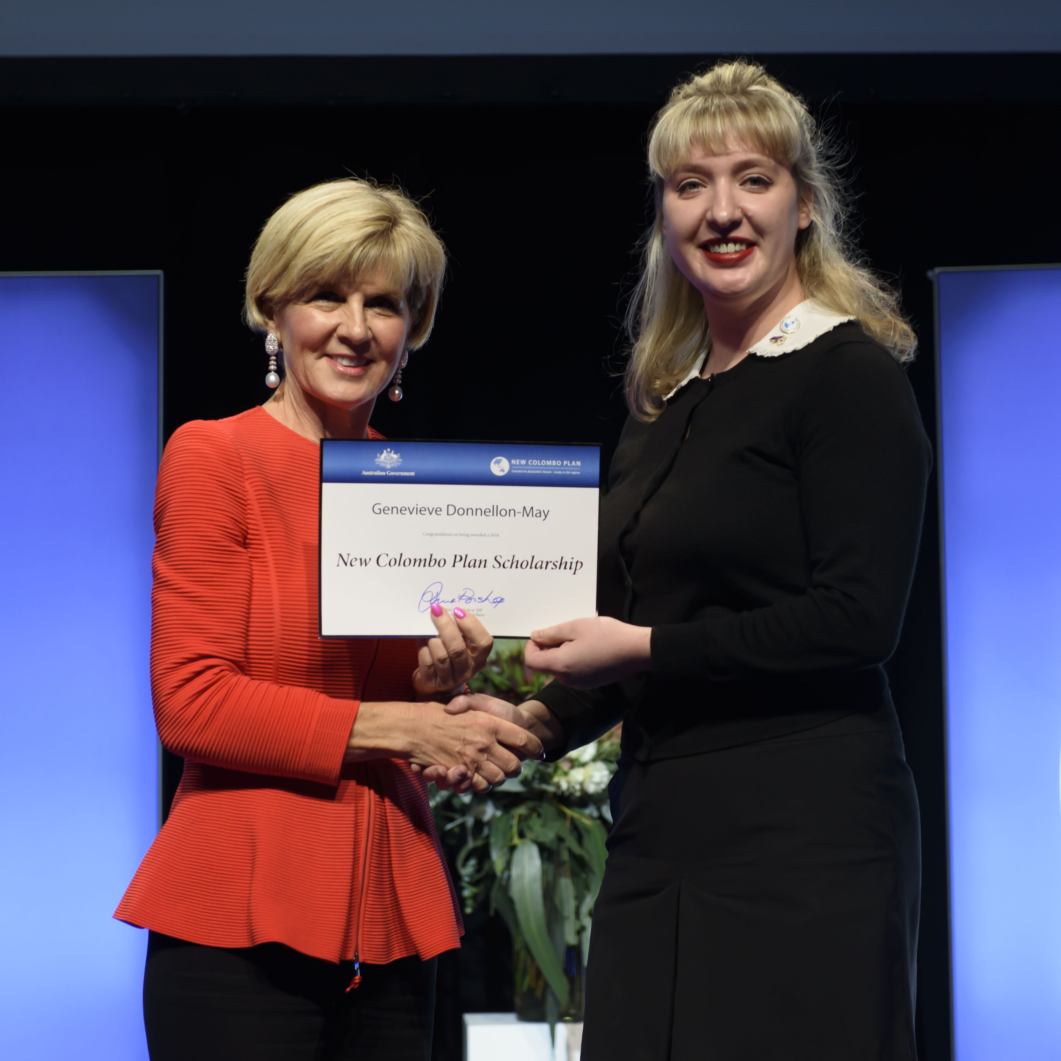 Foreign Minister Julie Bishop with Genevieve Donnellon-May, 2018 Republic of Korea Scholar, the University of Melbourne