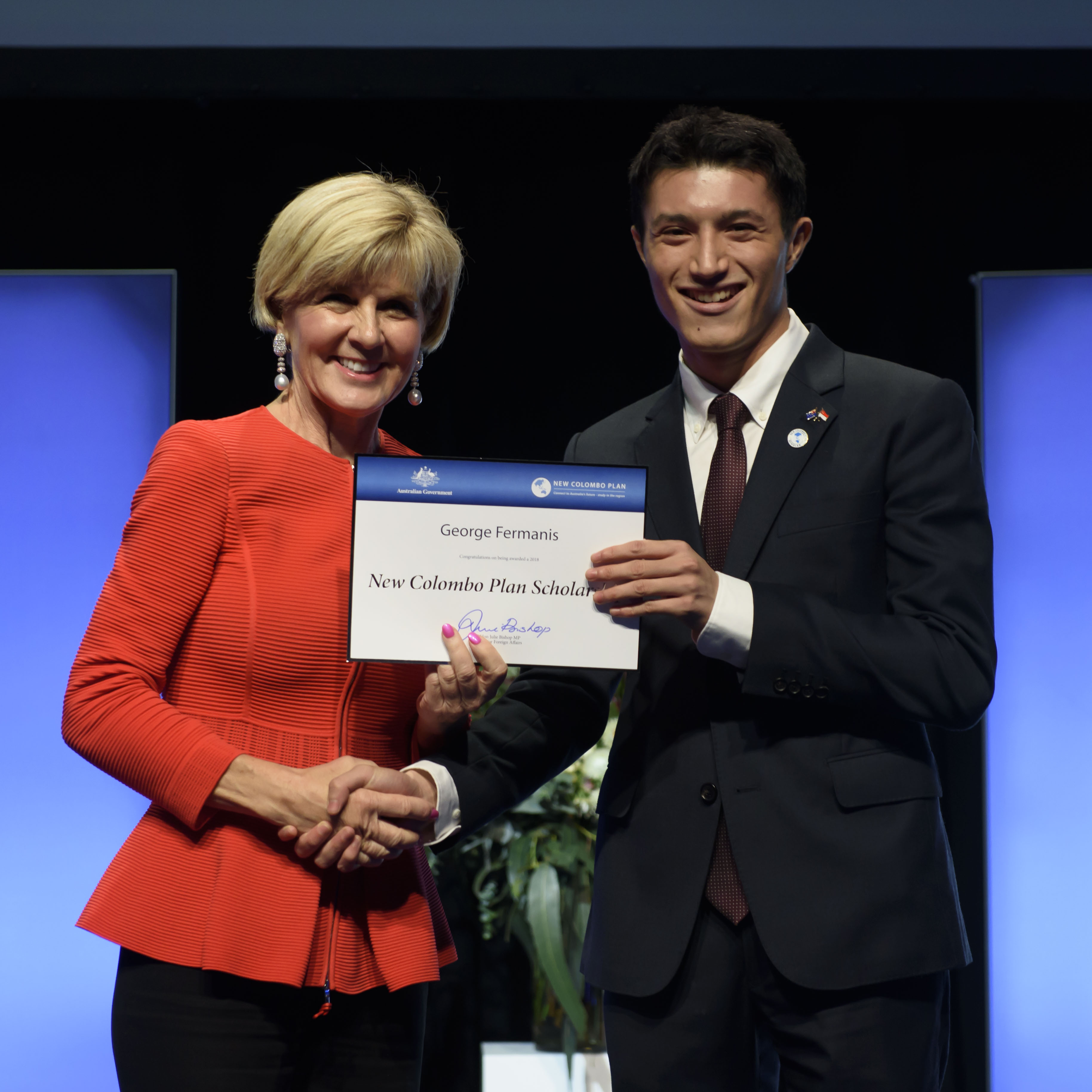 Foreign Minister Julie Bishop with George Fermanis, 2018 Singapore Scholar, UNSW Australia