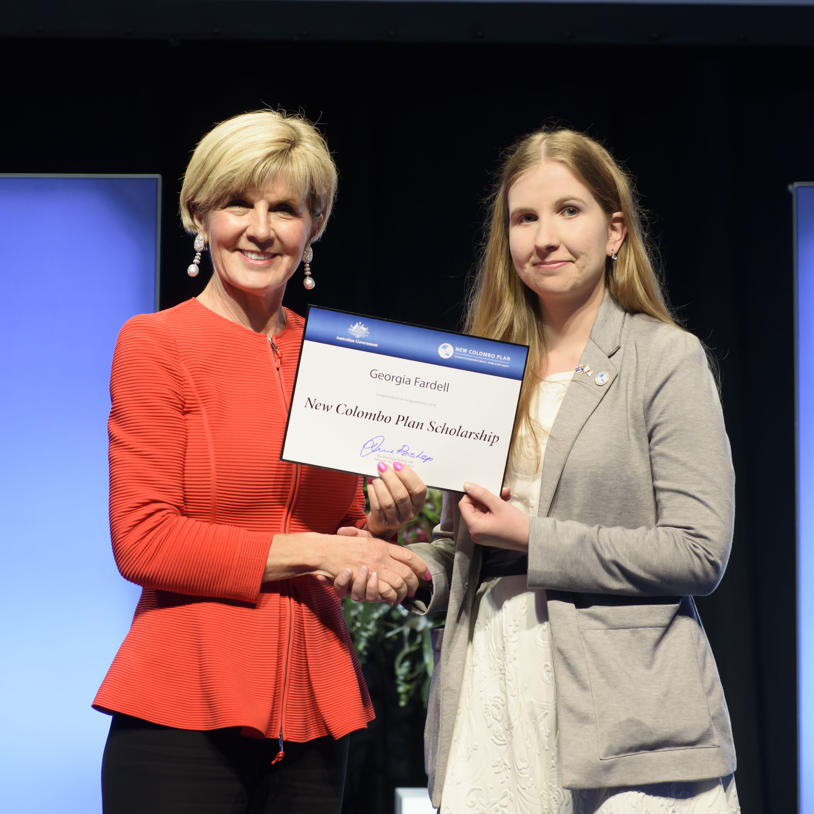 Foreign Minister Julie Bishop with Georgia Fardell, 2018 Japan Scholar, the University of Newcastle