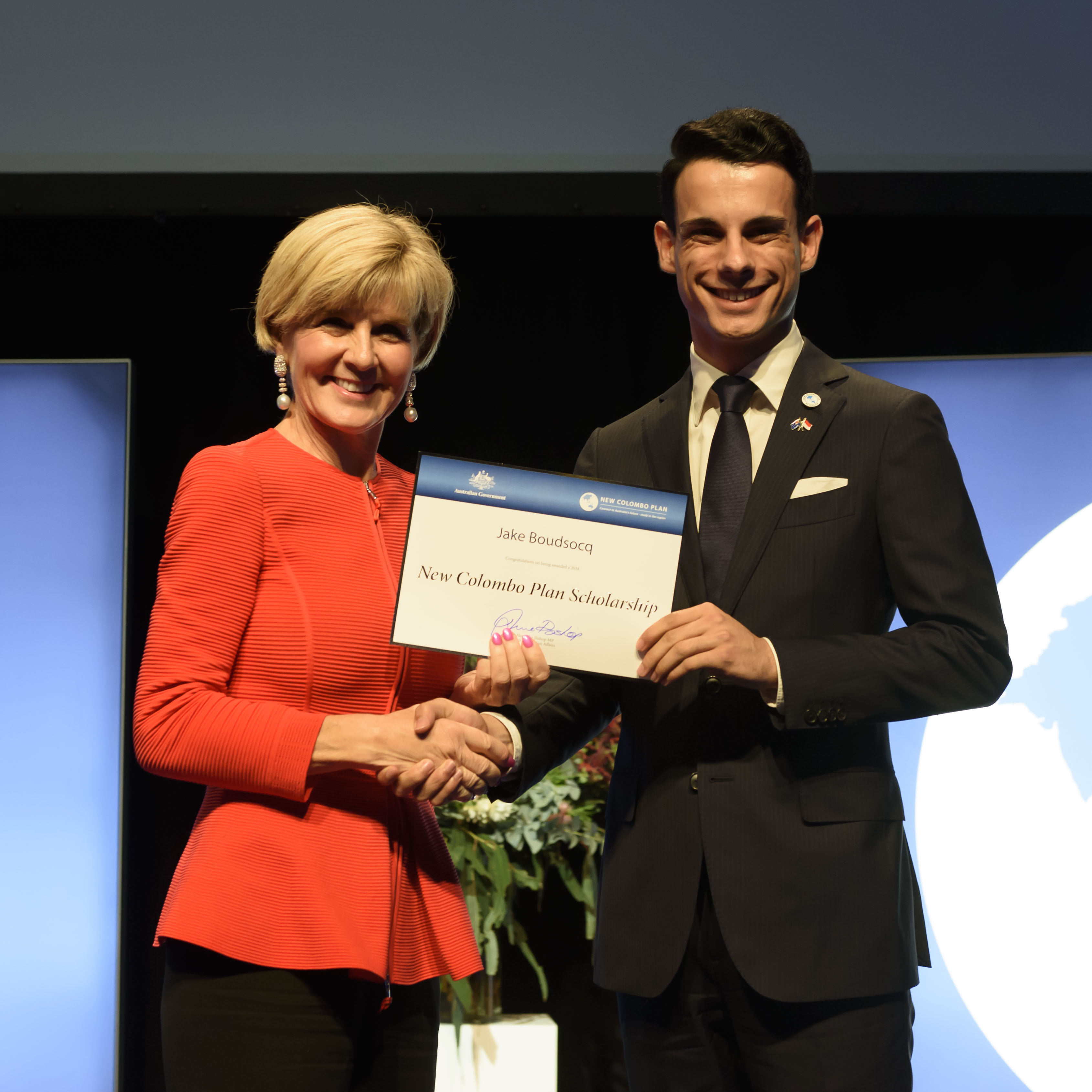 Foreign Minister Julie Bishop with Jake Boudsocq, 2018 Indonesia Scholar, Swinburne University of Technology