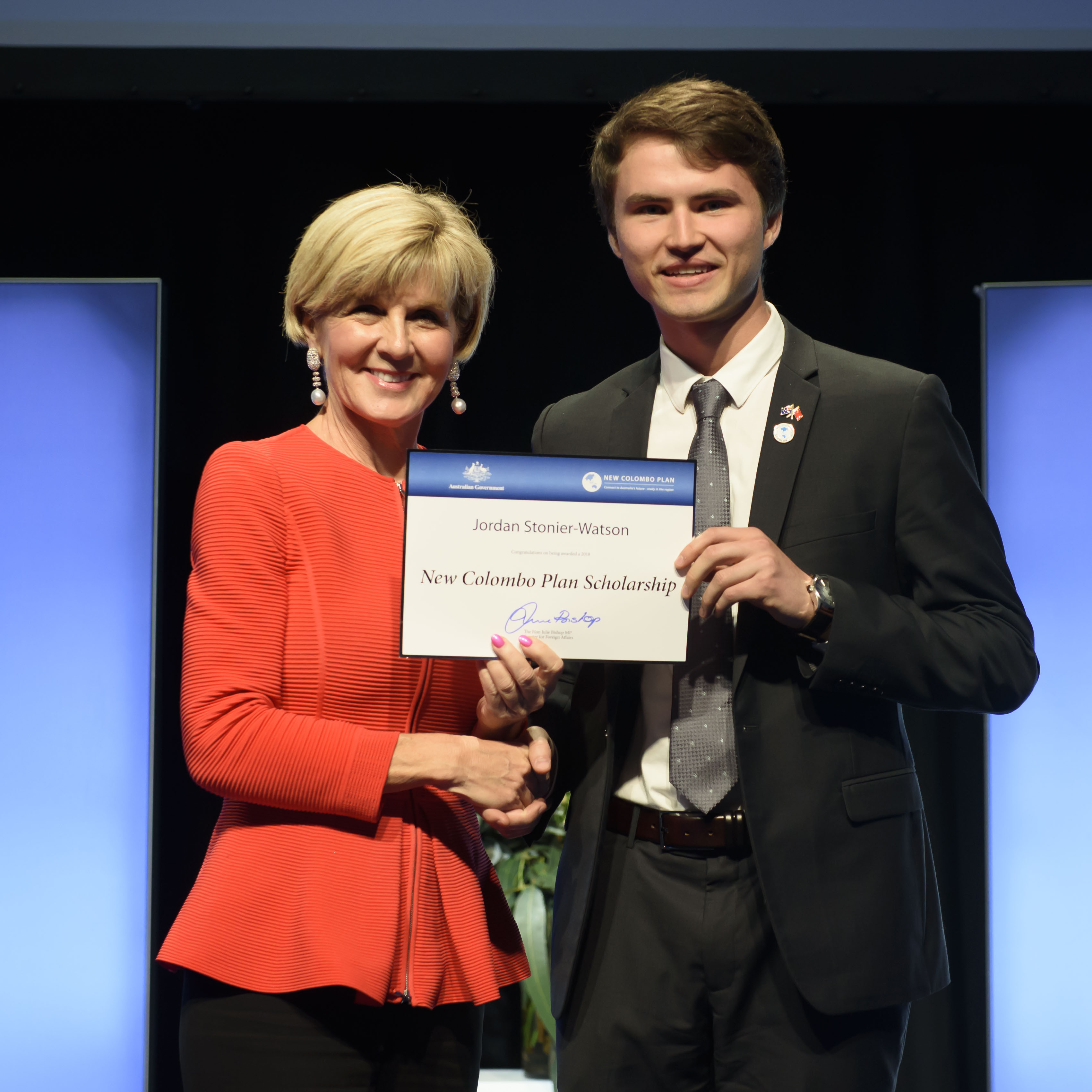 Foreign Minister Julie Bishop with Jordan Stonier-Watson, 2018 China Scholar, Monash University
