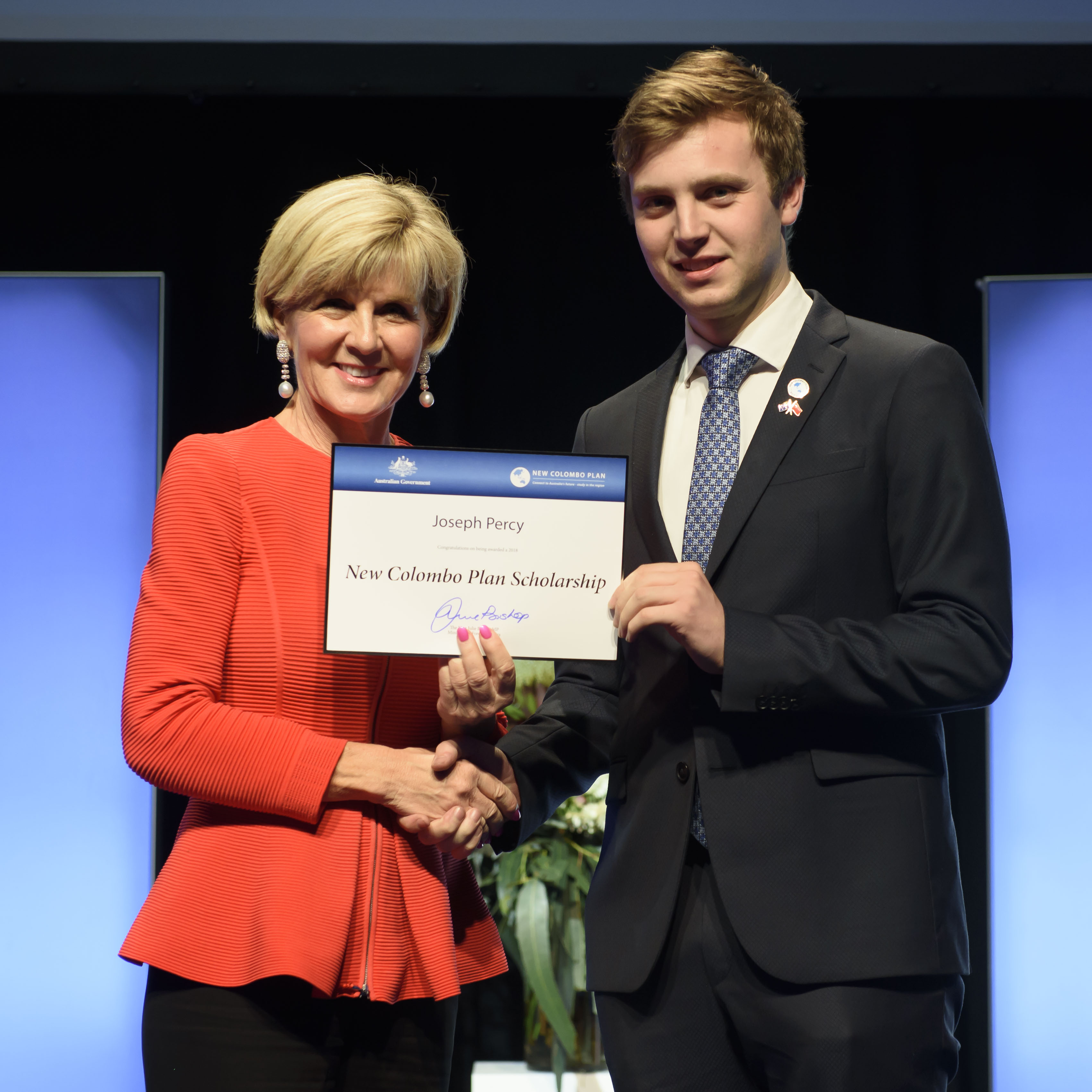 Foreign Minister Julie Bishop with Joseph Percy, 2018 China Scholar, the University of Melbourne