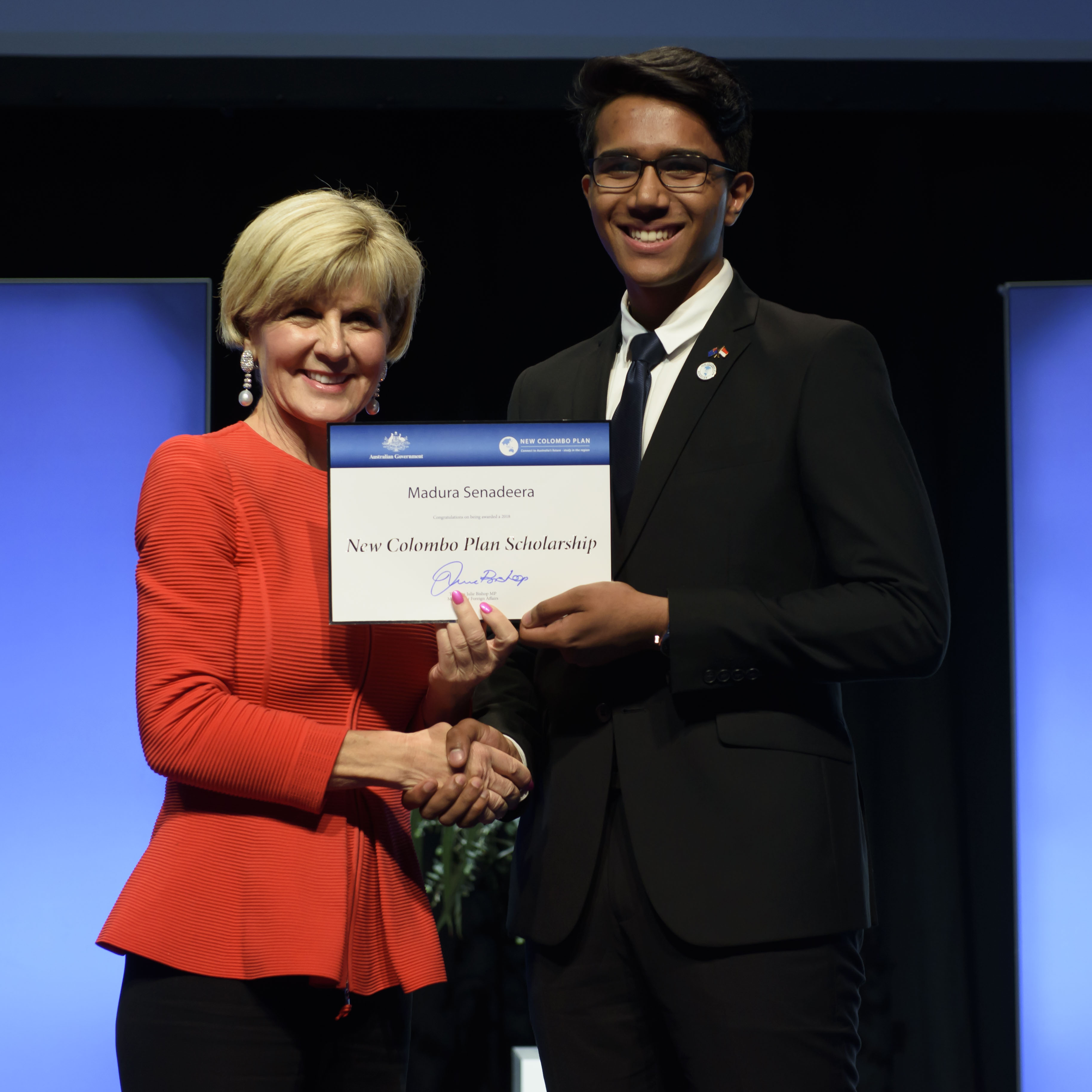 Foreign Minister Julie Bishop with Madura Senadeera, 2018 Singapore Scholar, Queensland University of Technology