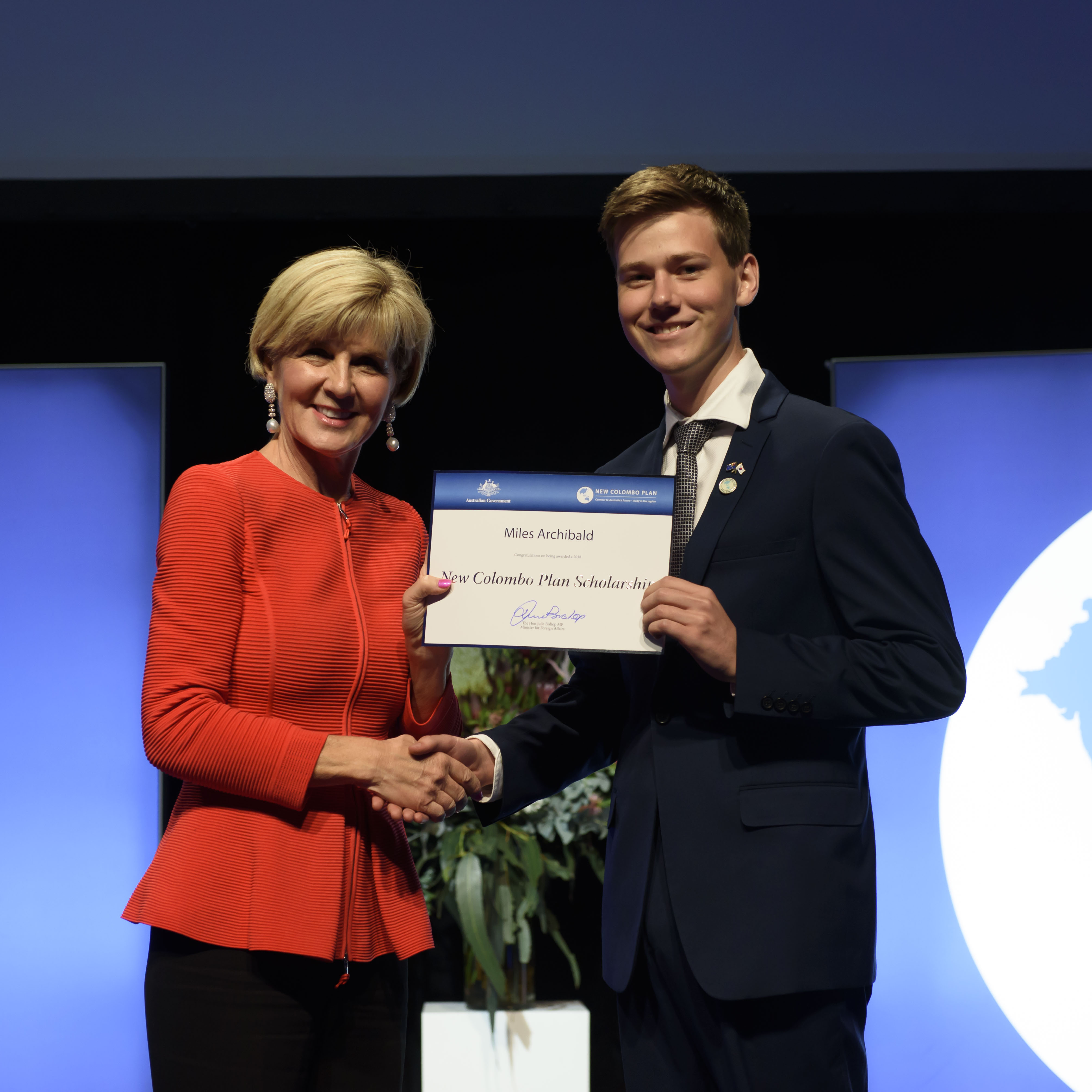 Foreign Minister Julie Bishop with Miles Archibald, 2018 Republic of Korea Scholar, University of New England