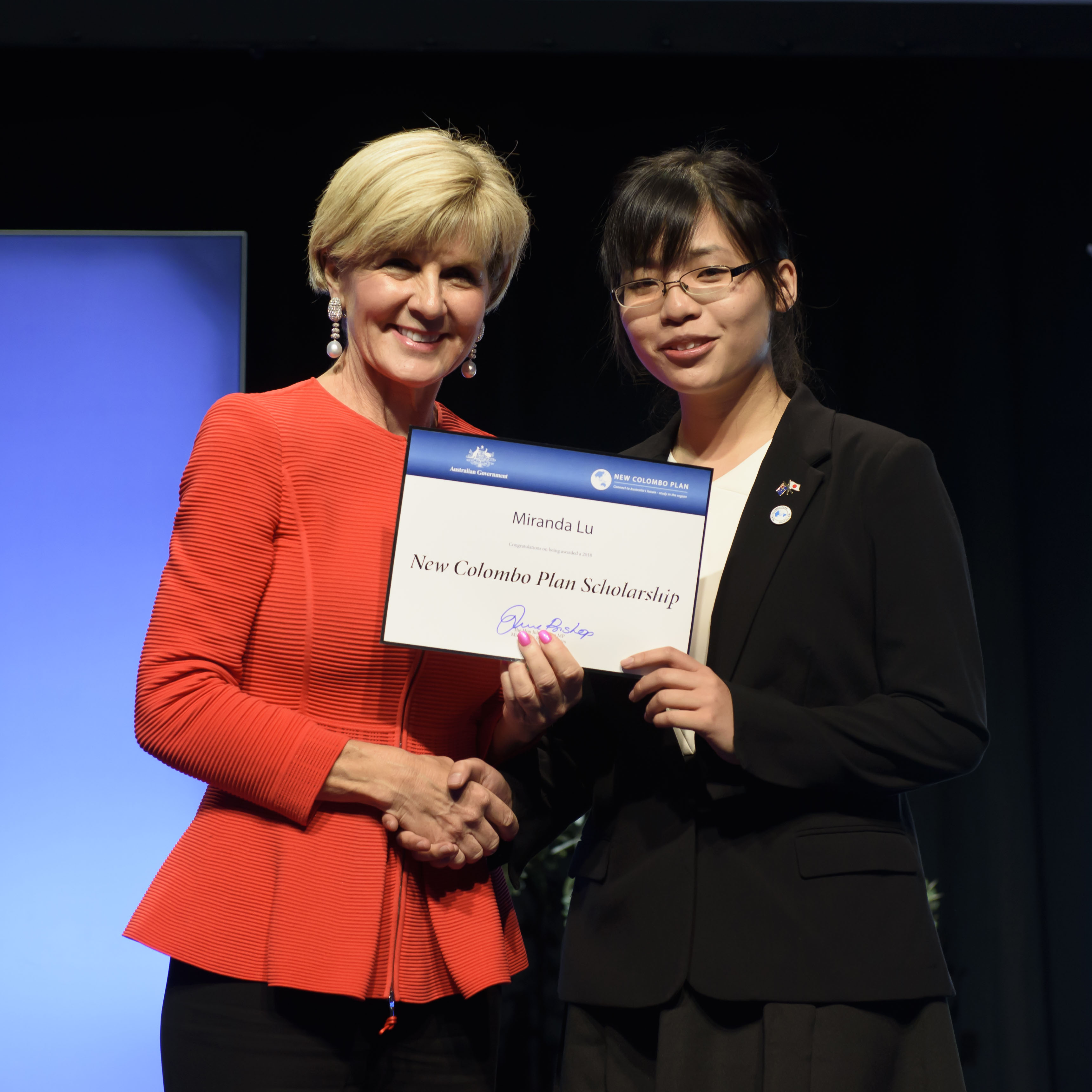 Foreign Minister Julie Bishop with Miranda Lu, 2018 Japan Scholar, UNSW Australia