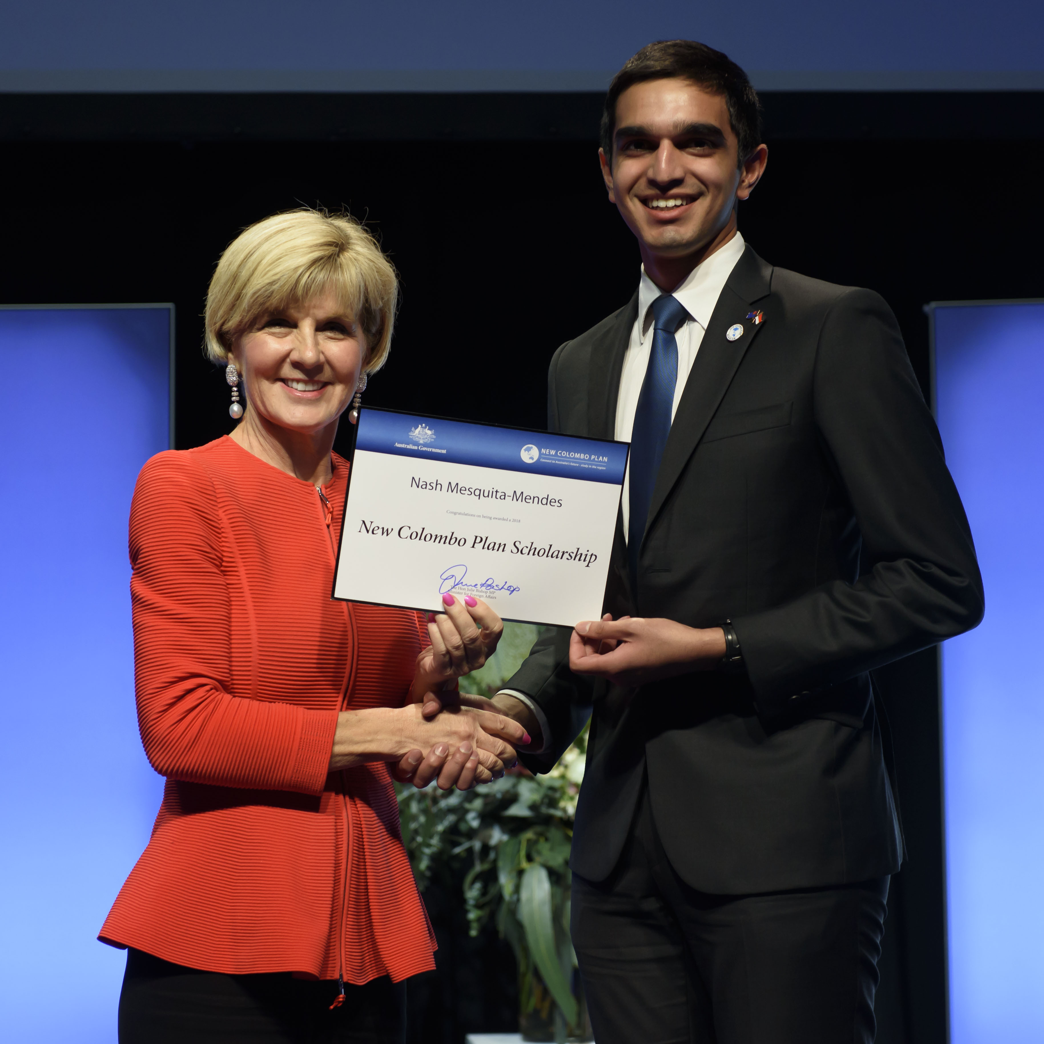 Foreign Minister Julie Bishop with Nash Mesquita-Mendes, 2018 Singapore Scholar, University of Southern Queensland