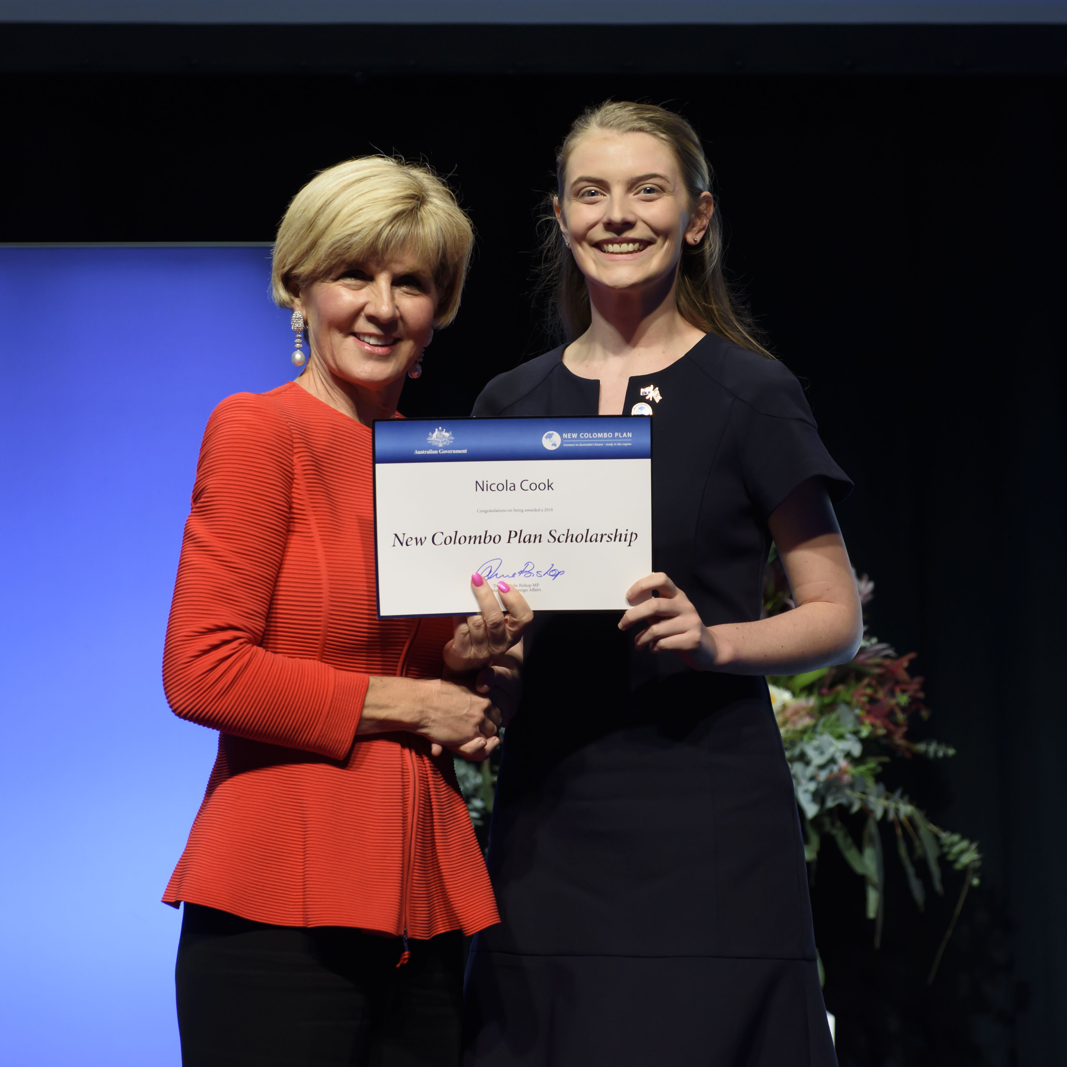 Foreign Minister Julie Bishop with Nicola Cook, 2018 Republic of Korea Scholar, the University of Queensland