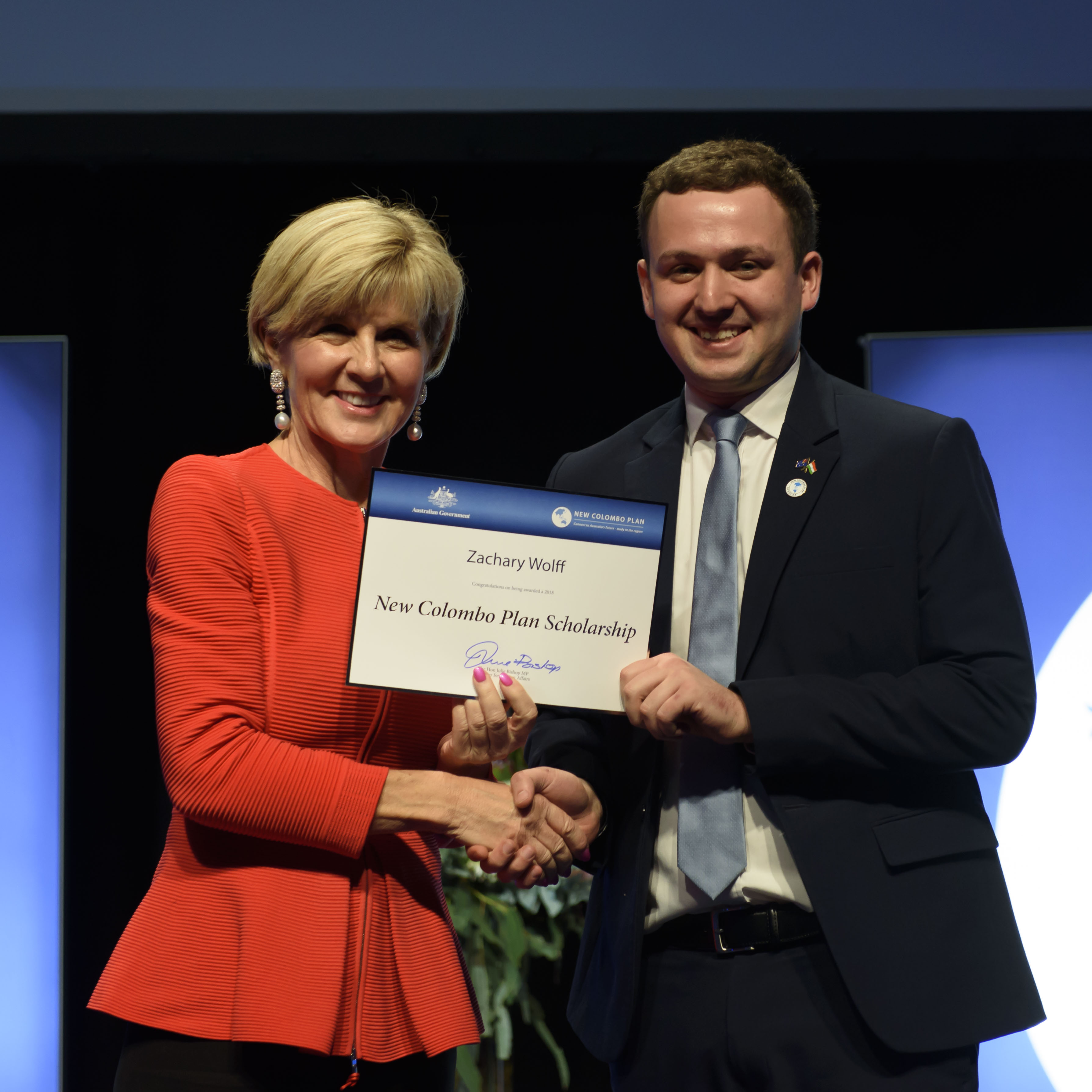 Foreign Minister Julie Bishop with Zachary David Wolff, 2018 India Scholar, the University of Sydney