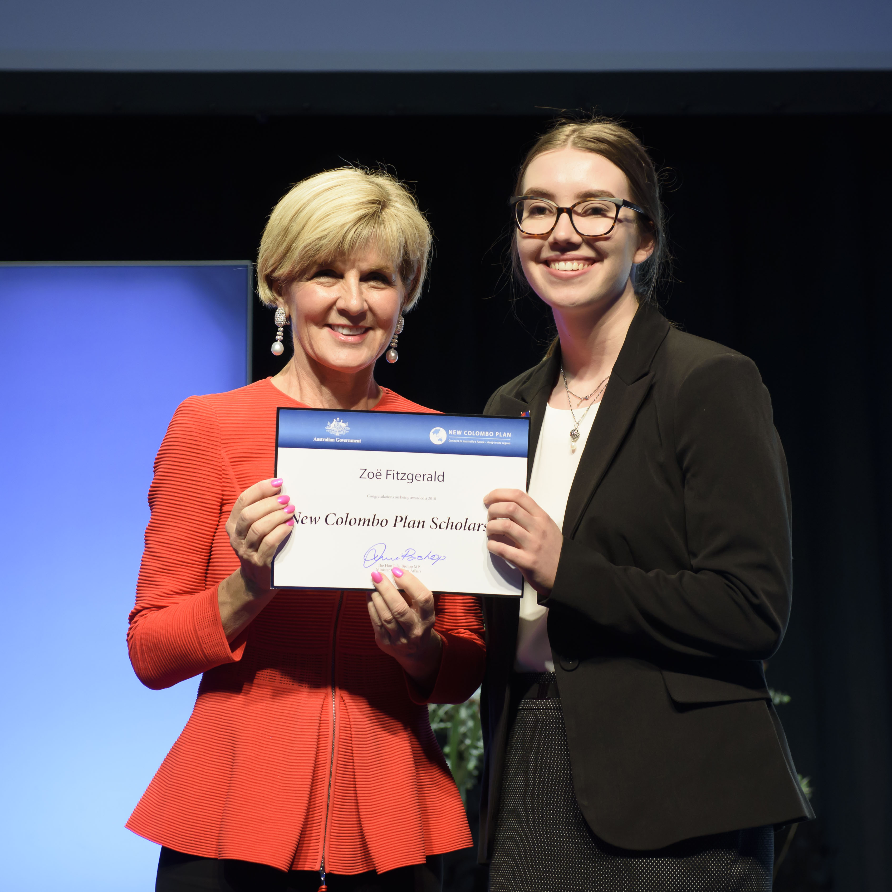Foreign Minister Julie Bishop with Zoë Fitzgerald, 2018 Hong Kong Fellow, the University of Western Australia