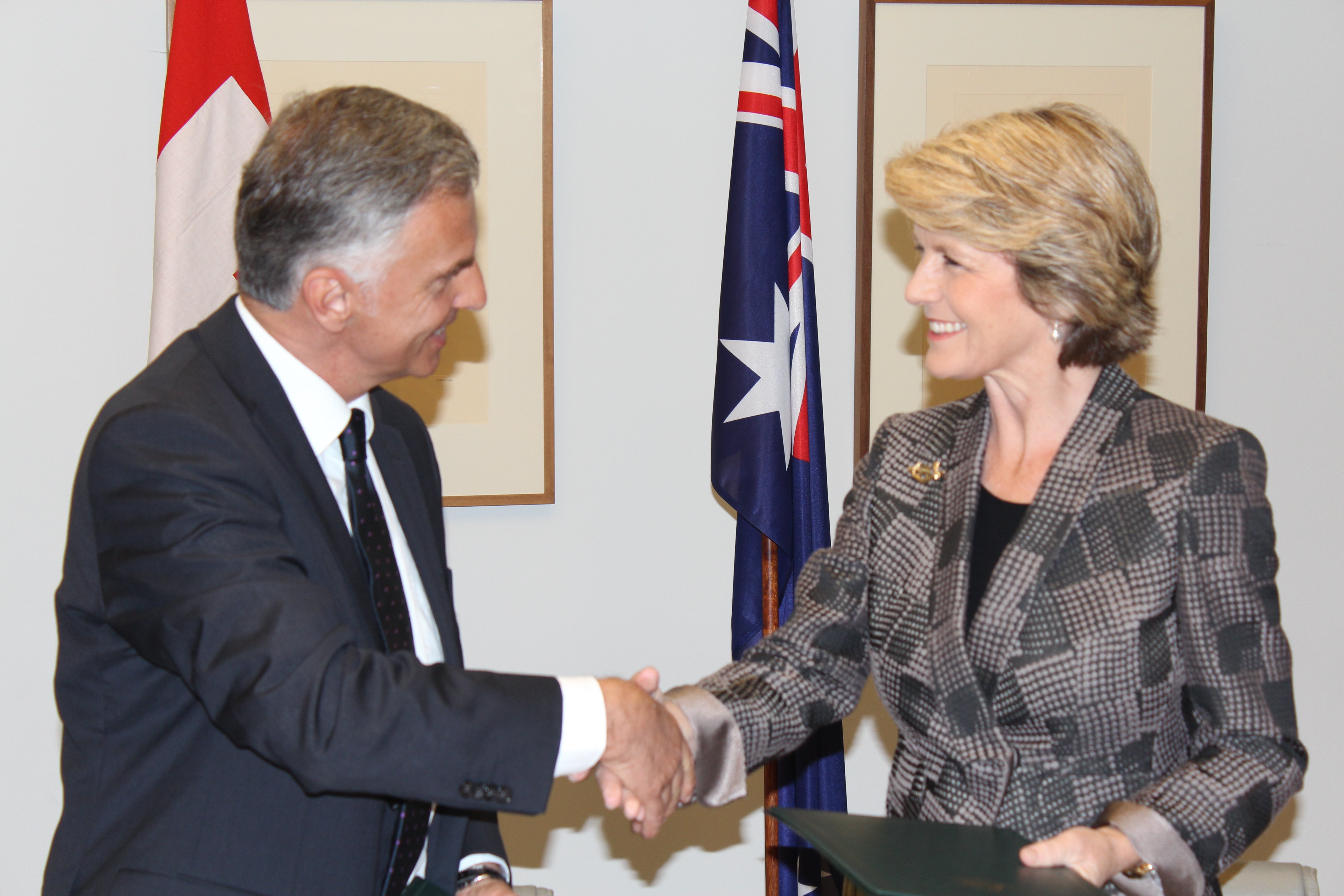 Foreign Minister Julie Bishop and Swiss Foreign Minister Didier Burkhalter sign an Memorandum of Understanding in Canberra.