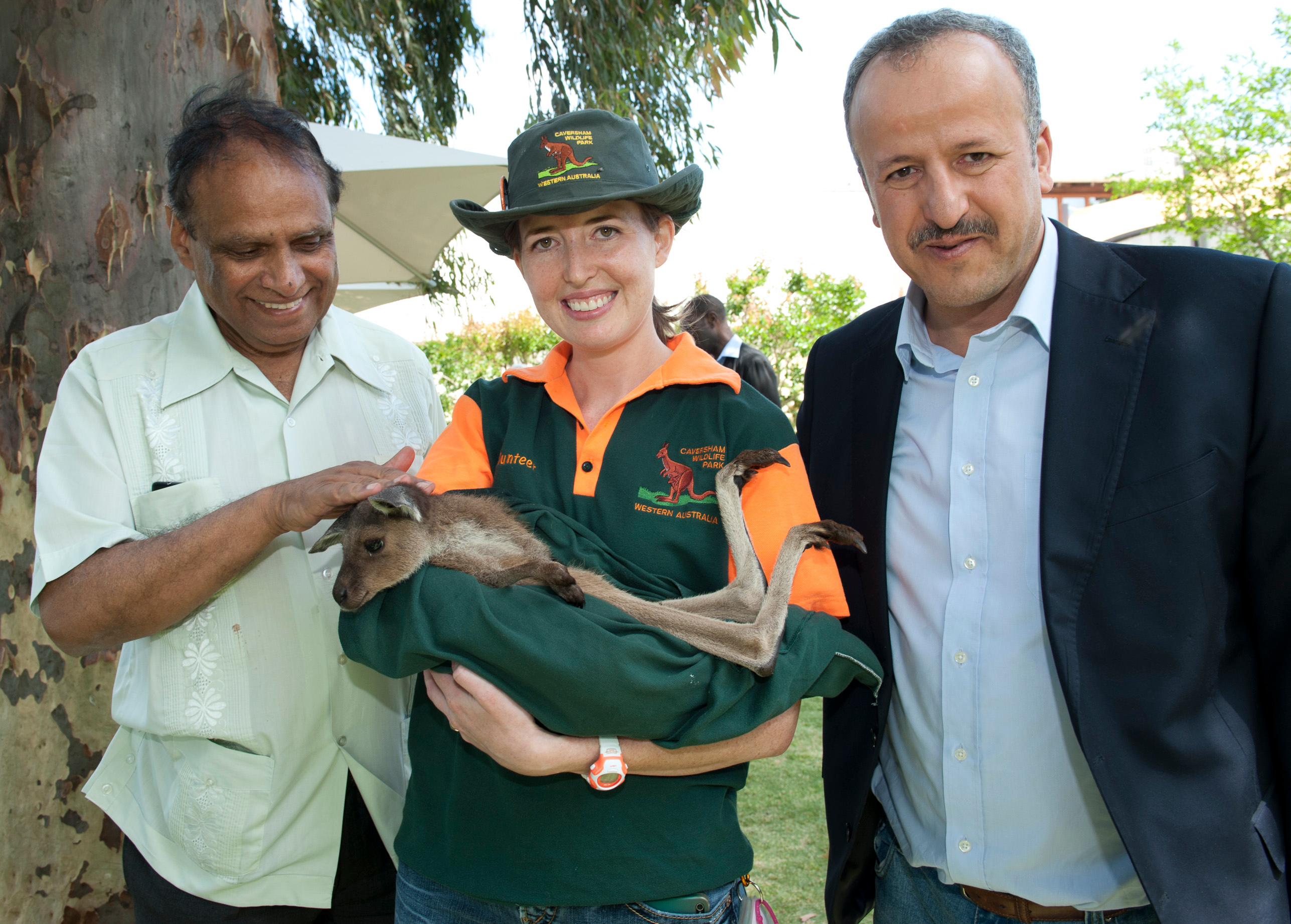 (L-R) Ebrahim Ismail Ebrahim, Deputy Minister of International Relations and Cooperation, South Africa and Fadhl Al-Maghafi, Minister Plenipotentiary, Yemen with a joey from Caversham Wildlife Park.