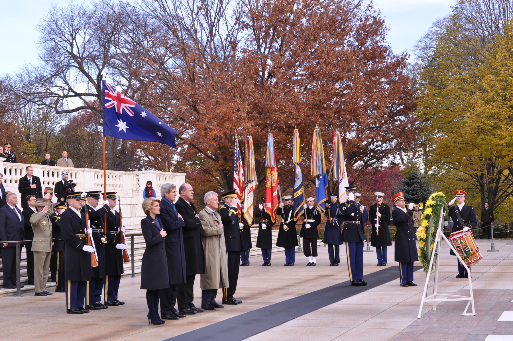 Foreign Minister Bishop with Defence Minister Johnston, Secretary Kerry and Secretary Hagel at the wreath laying ceremony, Arlington National Cemetery, Virginia, 20 Nov 2013.