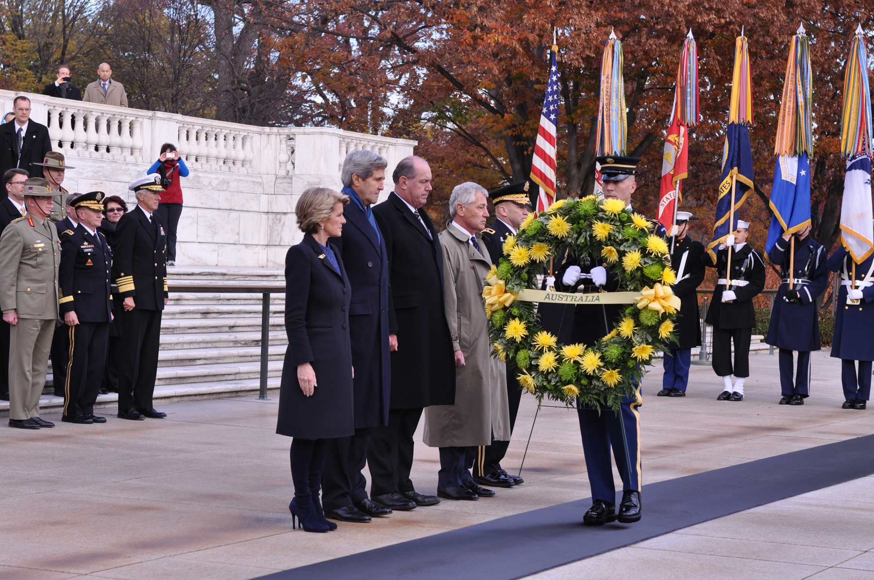 Foreign Minister Bishop with Defence Minister Johnston, Secretary Kerry and Secretary Hagel at the wreath laying ceremony, Arlington National Cemetery, Virginia, 20 Nov 2013.
