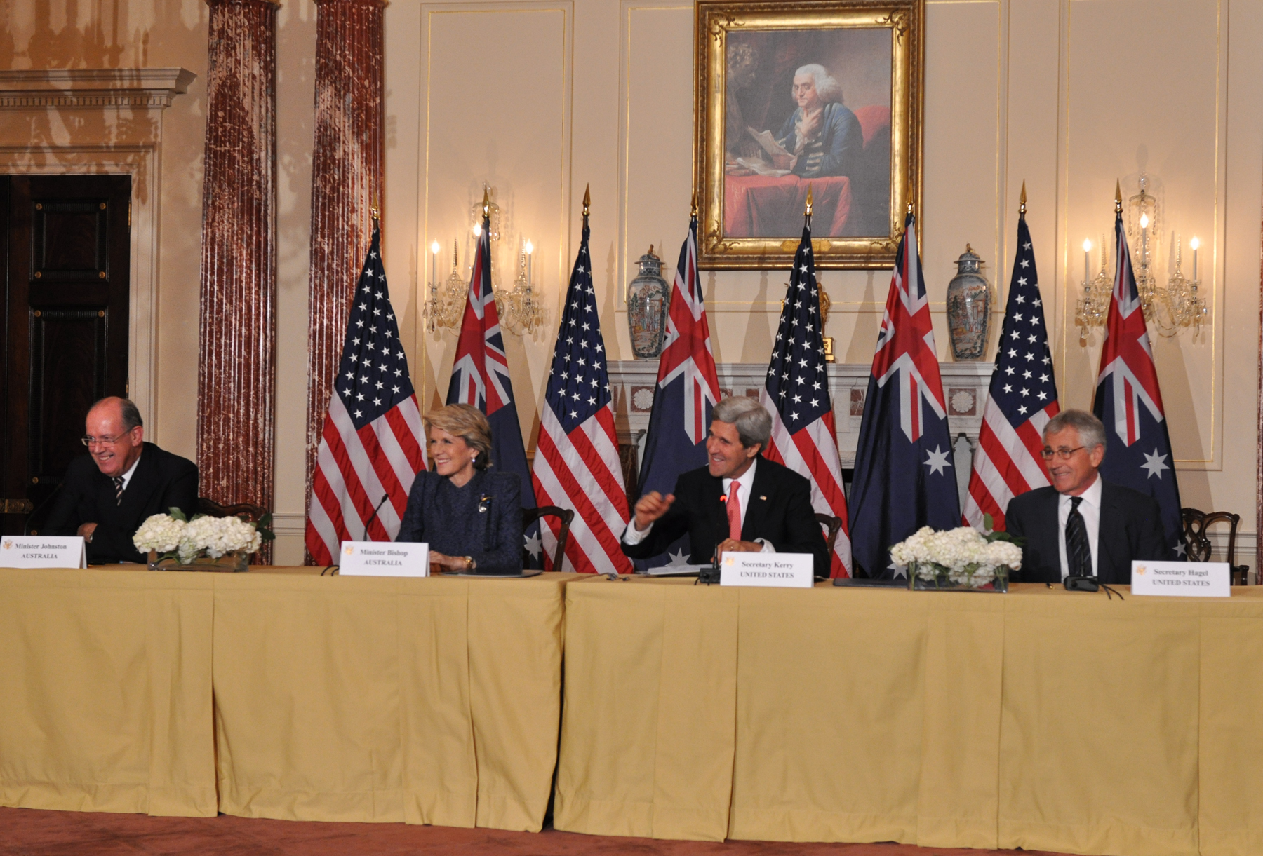 Foreign Minister Julie Bishop and Defence Minister David Johnston attend AUSMIN talks with US Secretary of State John Kerry and US Defense Secretary Chuck Hagel in Washington DC on 20 November 2013.
