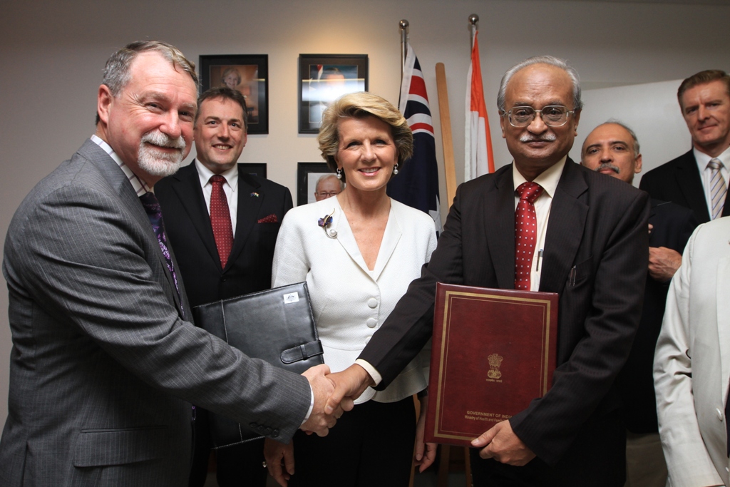 Foreign Minister Julie Bishop with Andrew Way of Alfred Health and Prof MC Misra of AIIMS after the MoU signing. 16 November 2013