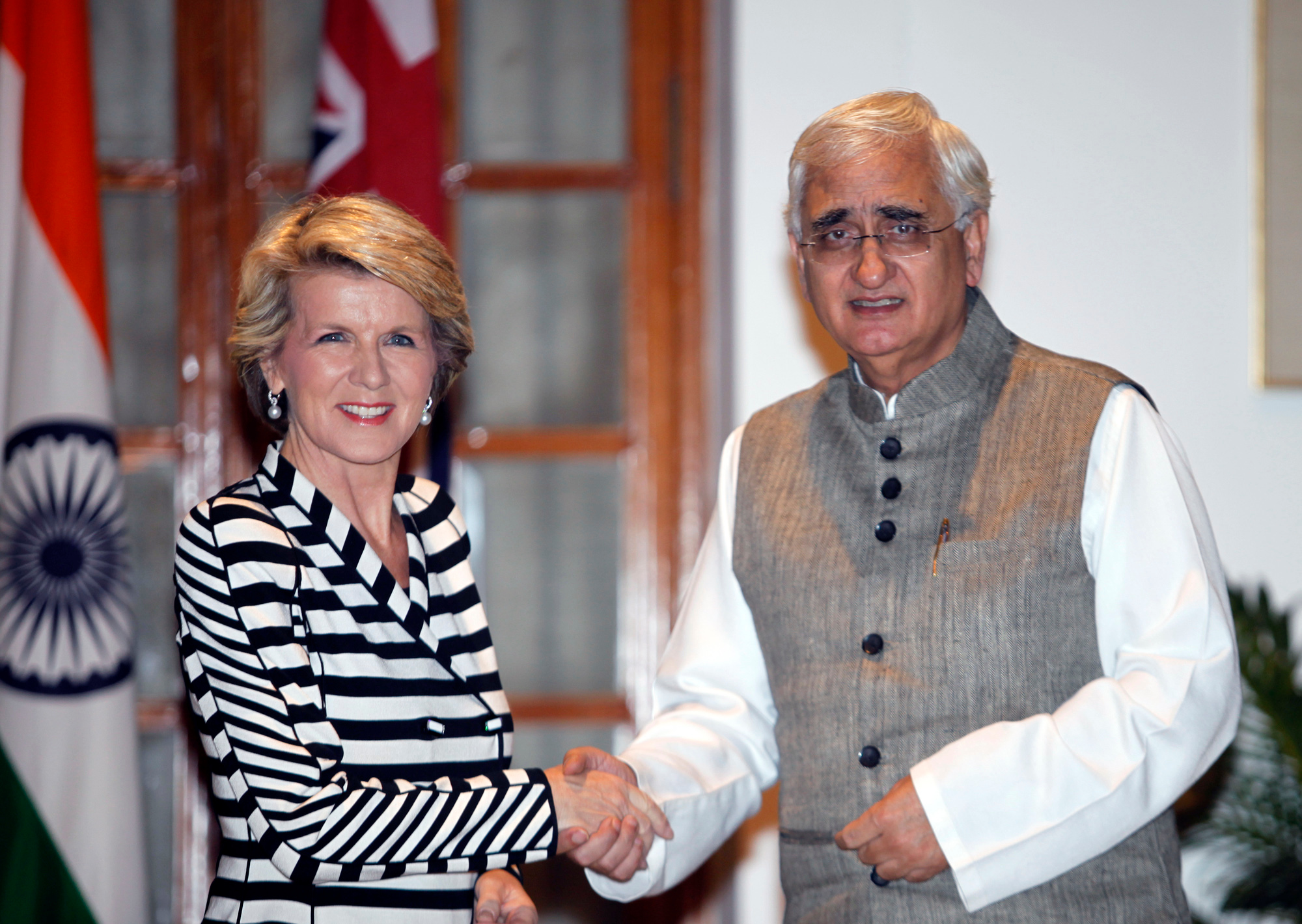Ms Bishop with India’s External Affairs Minister Salman Khurshid at Hyderabad House, New Delhi.