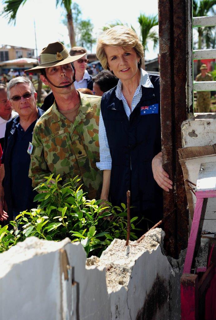 Ms Bishop with ADF Engineer Ken Golder visiting a Libertad Elementary School which the ADF are rehabilitating in Ormoc, Leyte, Philippines. 8 December 2013