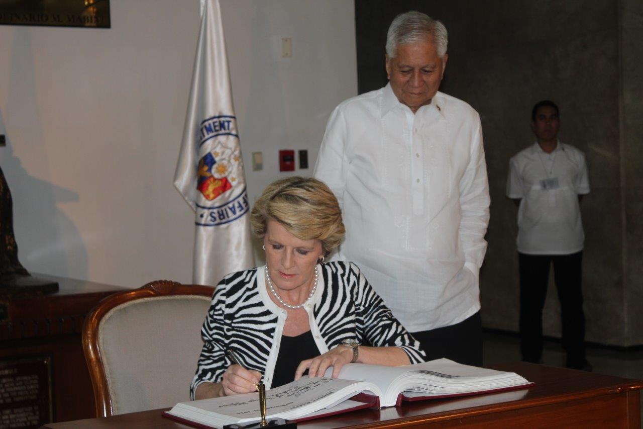 Australia's Foreign Minister Julie Bishop arrives at the Philippines Department of Foreign Affairs to meet with Foreign Secretary Albert del Rosario. 8 December 2013.