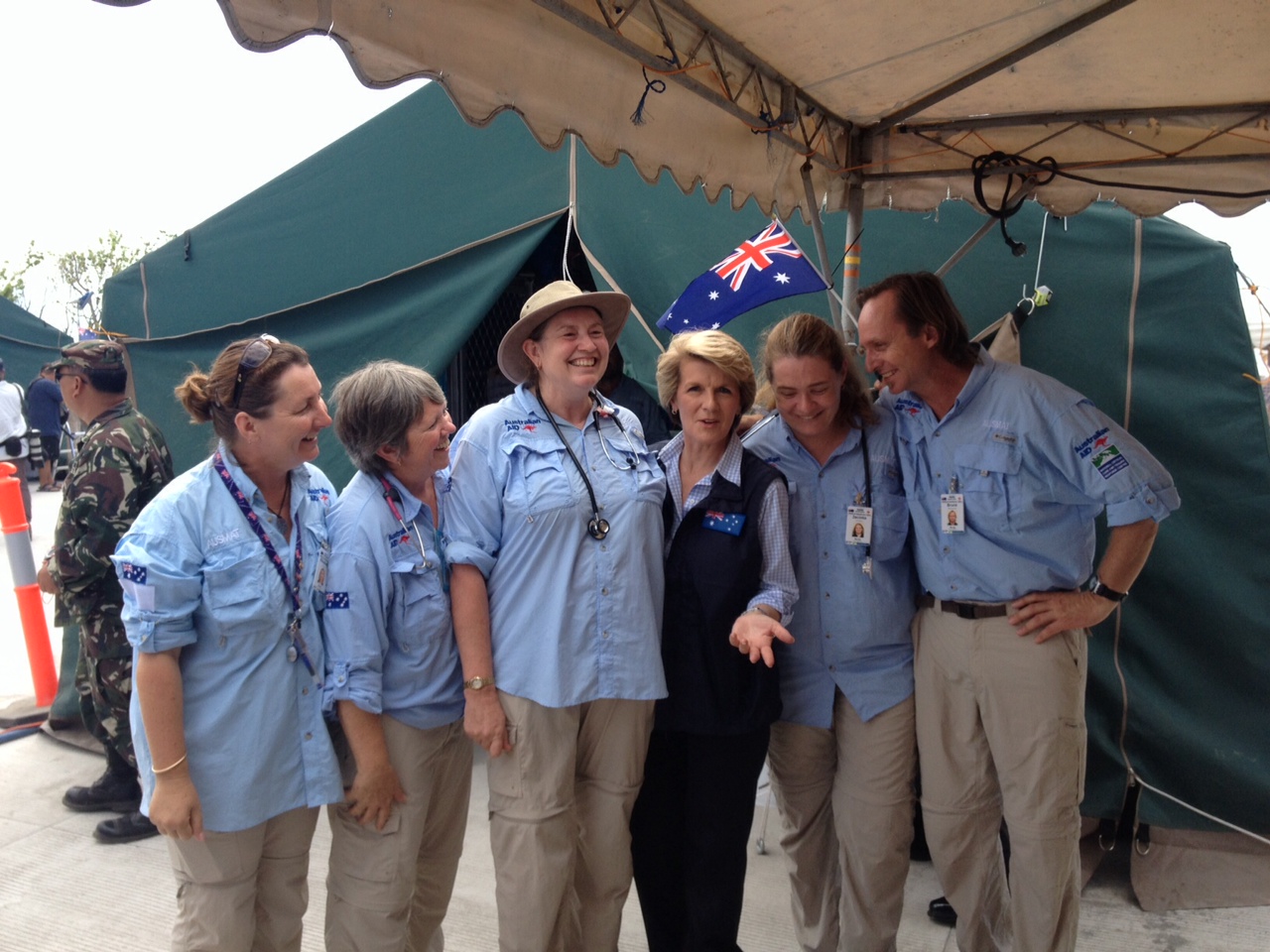 Australian Foreign Minister Julie Bishop thanks West Australians Elizabeth Harding (Nurse) Anne Coyne (midwife), Dr Helen Mead (Doctor) Jacinta O’Leary (Nurse) and Bruce Wicksteed (Paramedic/nurse) for their work in the field hospital in Tacloban. 8 December 2013.