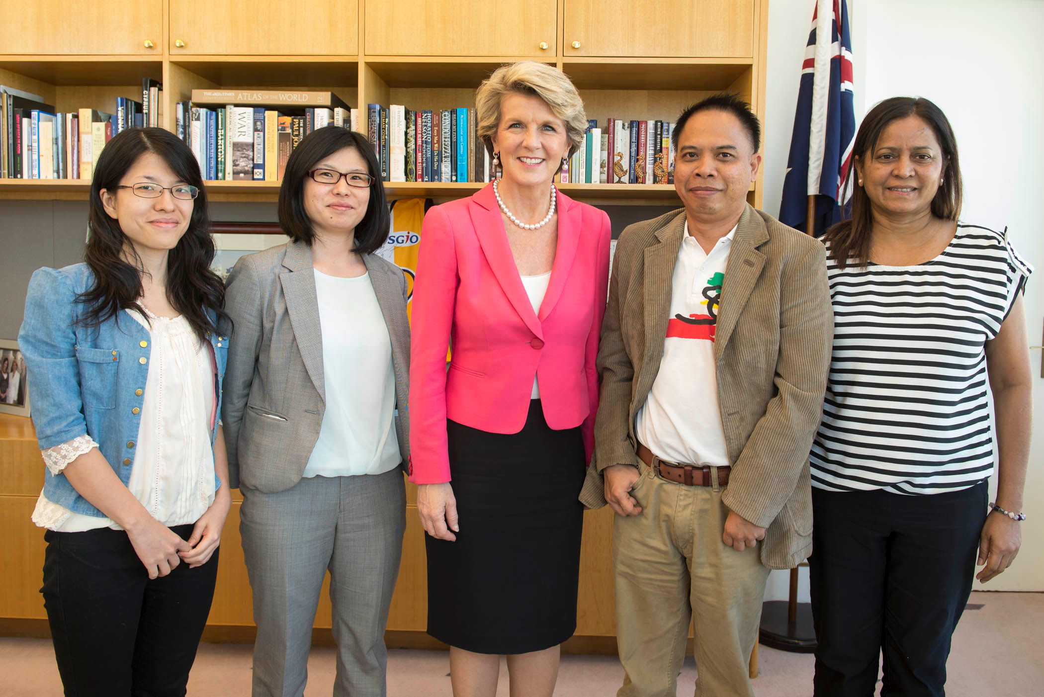 Foreign Minister Julie Bishop with journalists from New Colombo Plan pilot locations. 10 December 2013.