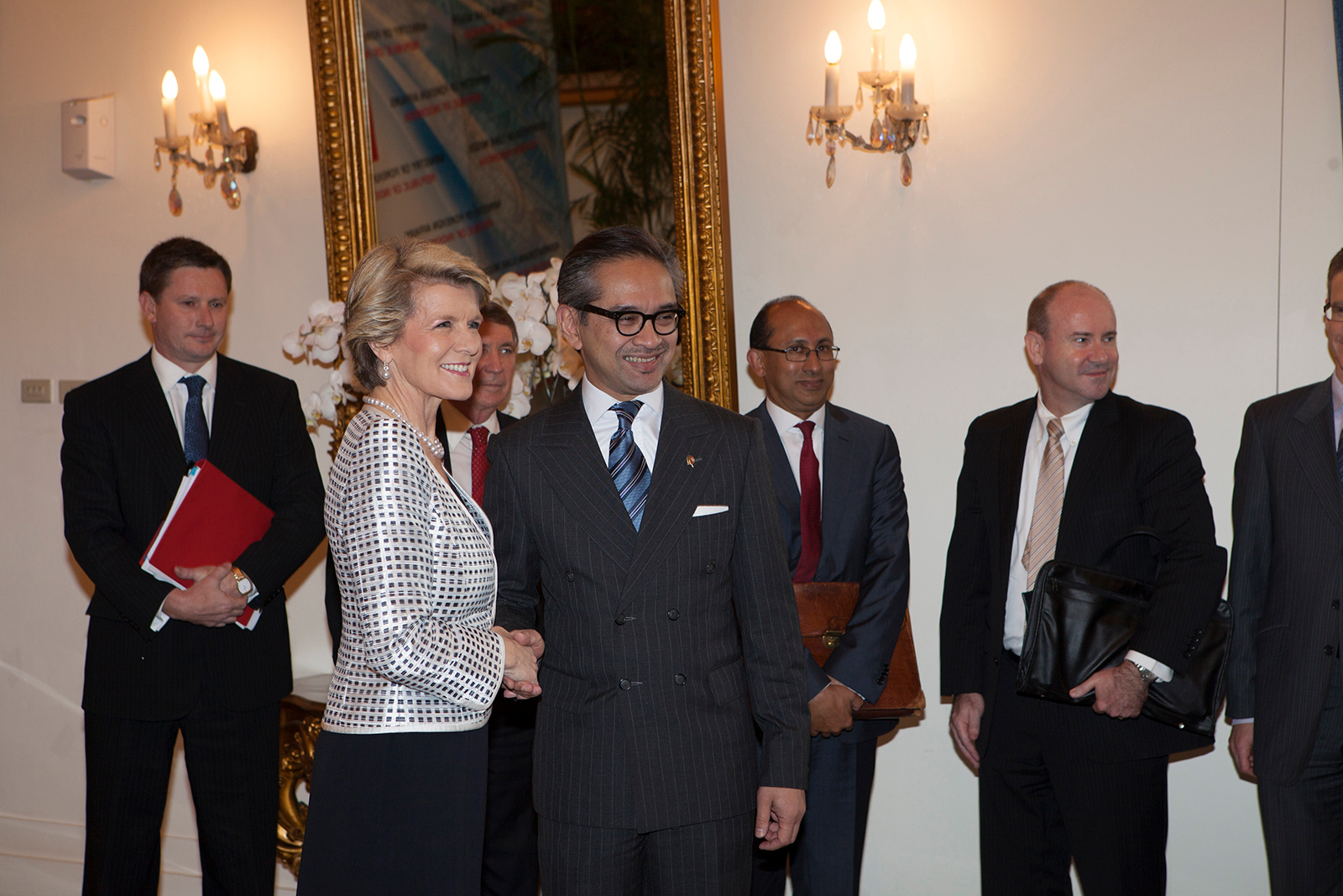 FM Natalegawa greets FM Bishop on her arrival at Gedung Pancasila with the Australian delegation in the background. 5 December 2013