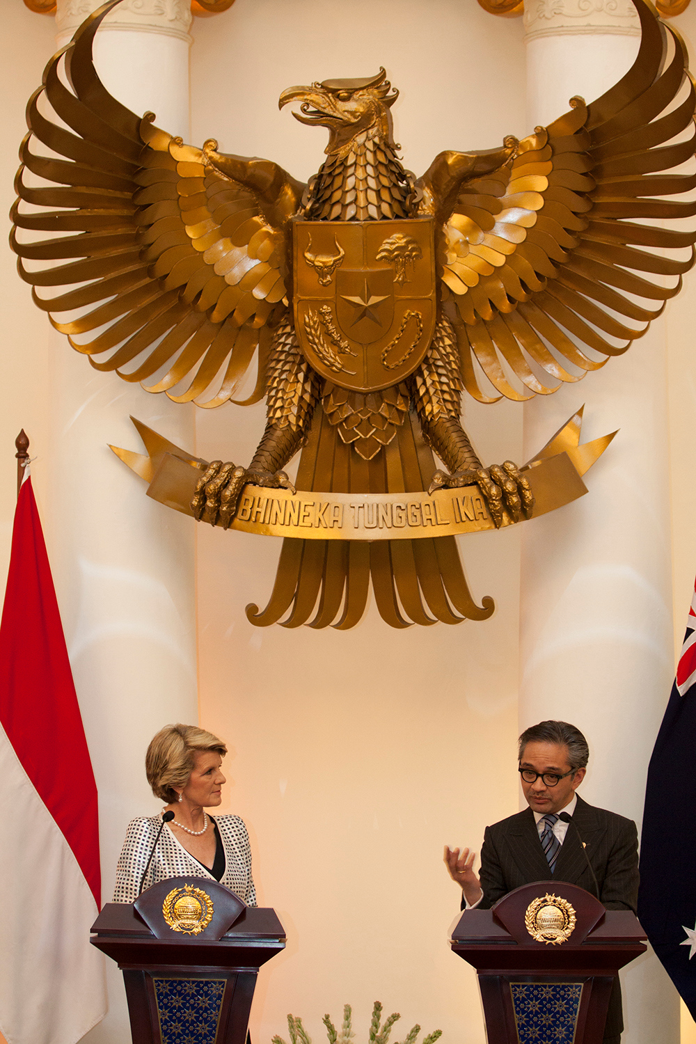 Foreign Minister Julie Bishop and Indonesian Foreign Minister Dr Marty Natalegawa hold a media conference at Gedung Pancasila in Jakarta, 5 December 2013