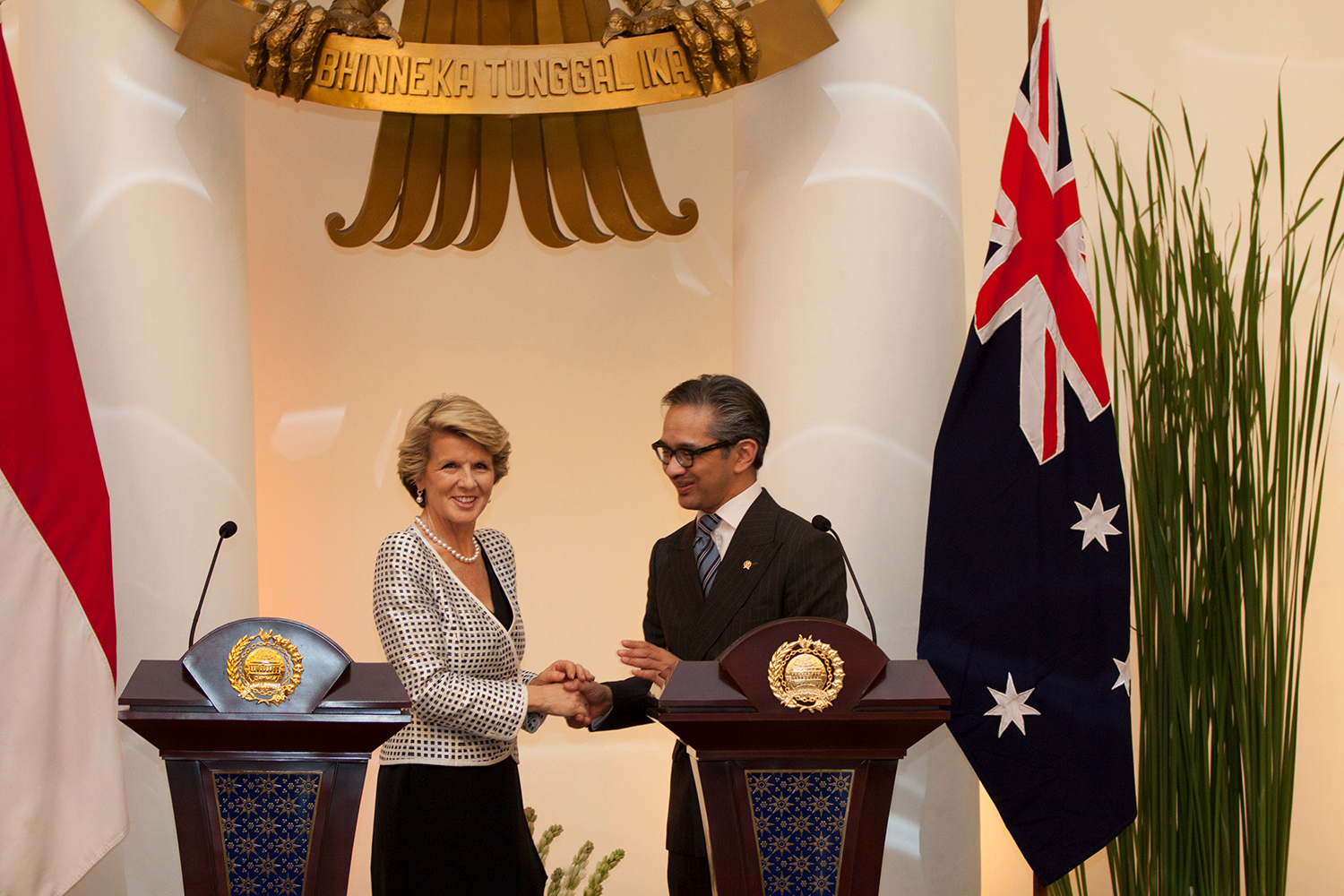 Foreign Minister Julie Bishop and Indonesian Foreign Minister Dr Marty Natalegawa hold a media conference at Gedung Pancasila in Jakarta, 5 December 2013