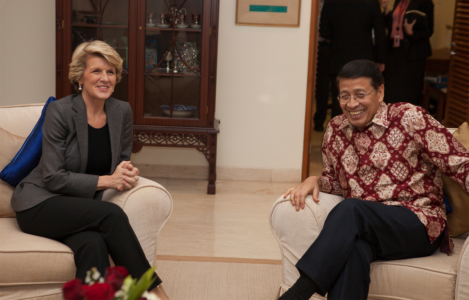 Foreign Minister Julie Bishop meets with Dr Hassan Wirajuda at the Ambassador's residence. 5 December 2013.