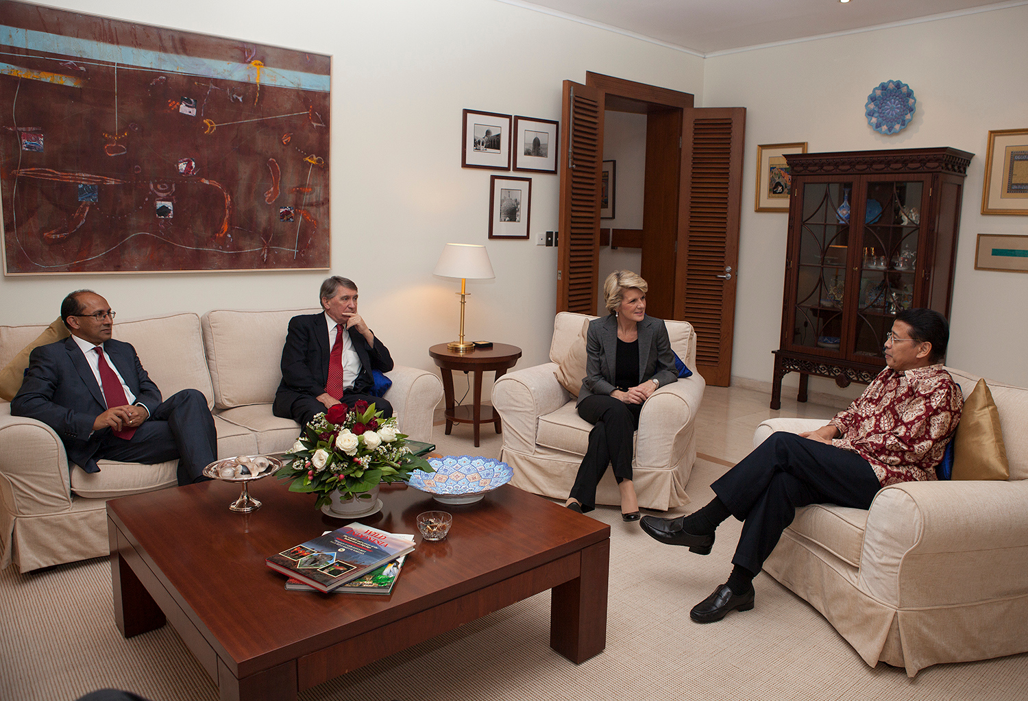 Foreign Minister Julie Bishop meets with Dr Hassan Wirajuda at the Ambassador's residence. 5 December 2013.