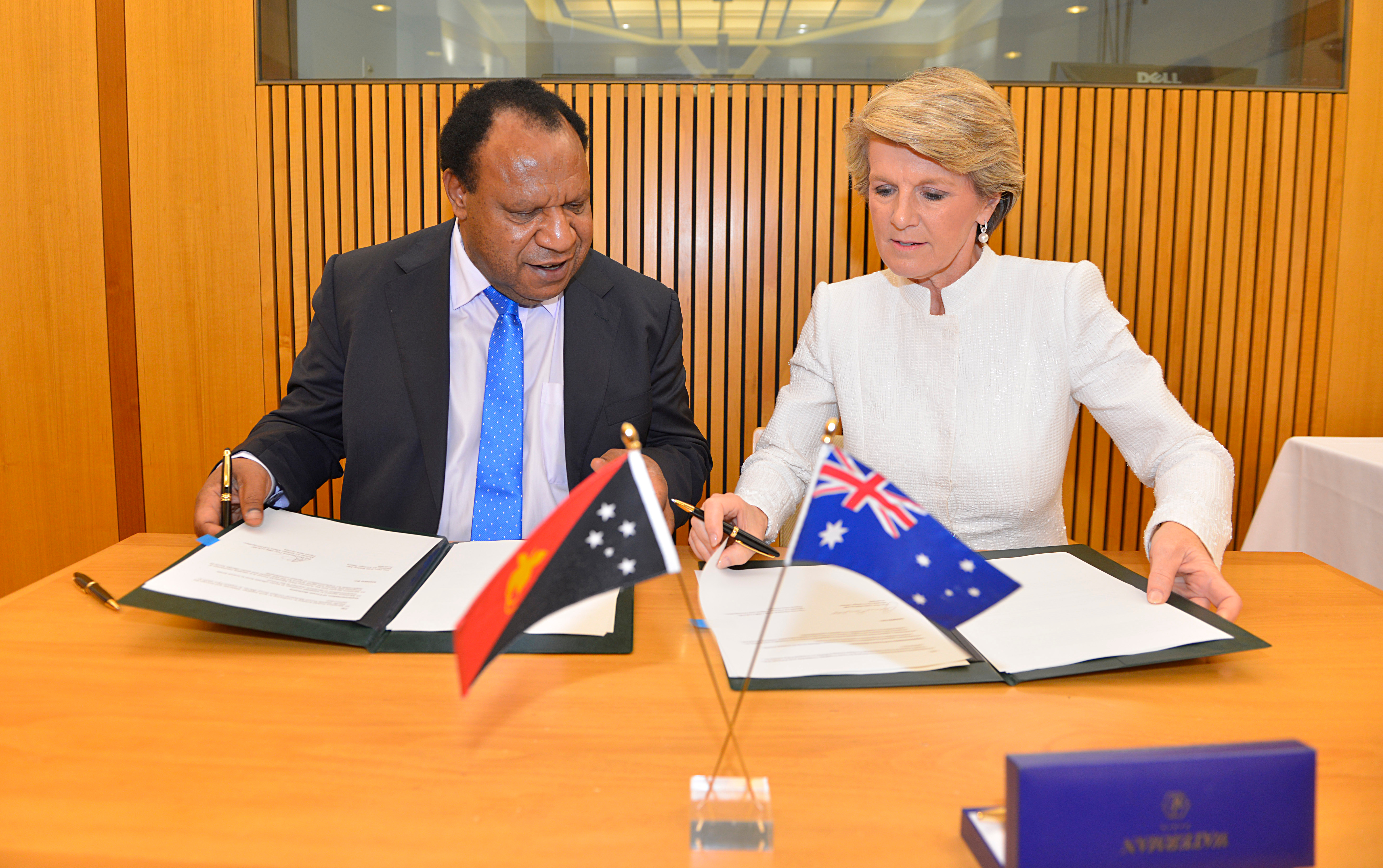 Foreign Minister Julie Bishop and her Papua New Guinean counterpart Rimbink Pato sign the joint communique. Parliament House, Canberra. 11 December 2013.