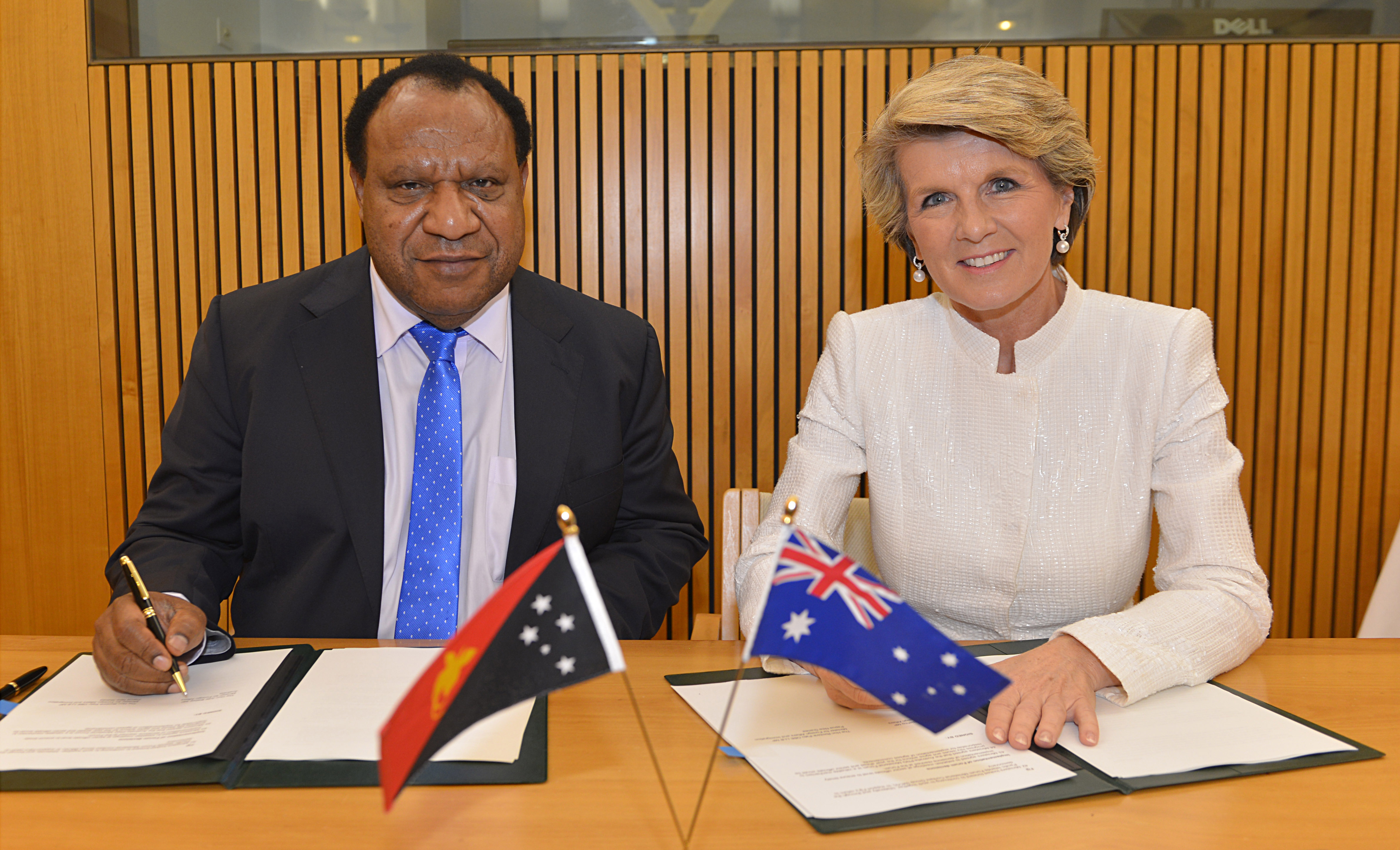 Foreign Minister Julie Bishop and her Papua New Guinean counterpart Rimbink Pato sign the joint communique. Parliament House, Canberra. 11 December 2013.