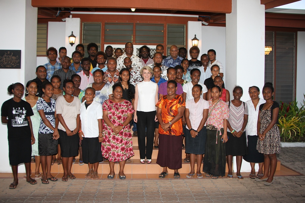 Foreign Minister Julie Bishop with the 60 Solomon Islanders awarded Australia Awards scholarships for 2014 (17 December 2013)