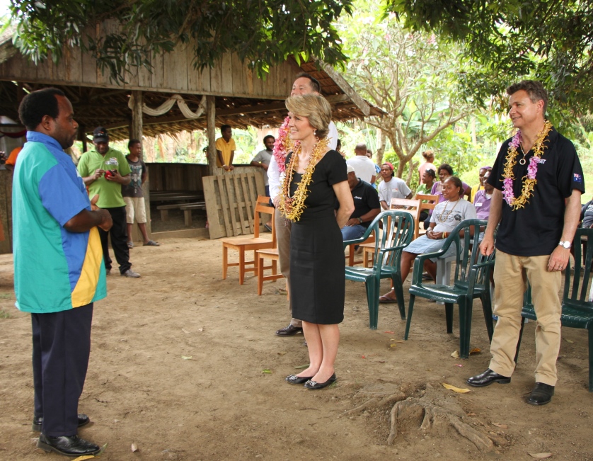 Pastor Lemuel Inomae addresses Foreign Minister Julie Bishop and the Australian delegation during their visit to Burns Creek, Honiara (17 December 2013)