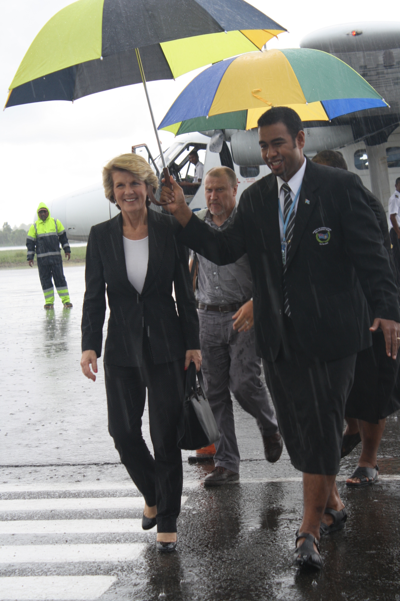 Arriving in Suva, Minister Bishop is escorted across the tarmac at Nausori Airport, accompanied by a Fiji Government official and Acting Australian High Commissioner Glenn Miles. Photo: DFAT. Friday, 14 February 2014.